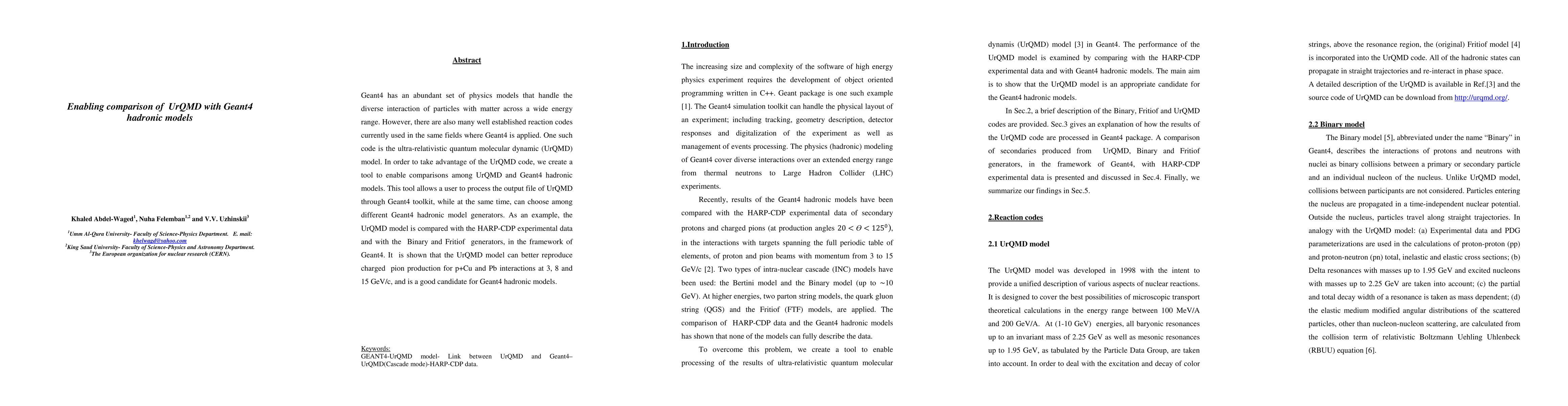 This paper introduces a tool for comparing UrQMD hadronic models with Geant4's diverse physics models, demonstrating UrQMD's superior performance in charged pion production for p+Cu and Pb interactions at various energies. The tool facilitates processing UrQMD outputs through the Geant4 toolkit and allows selection among different Geant4 hadronic model generators.