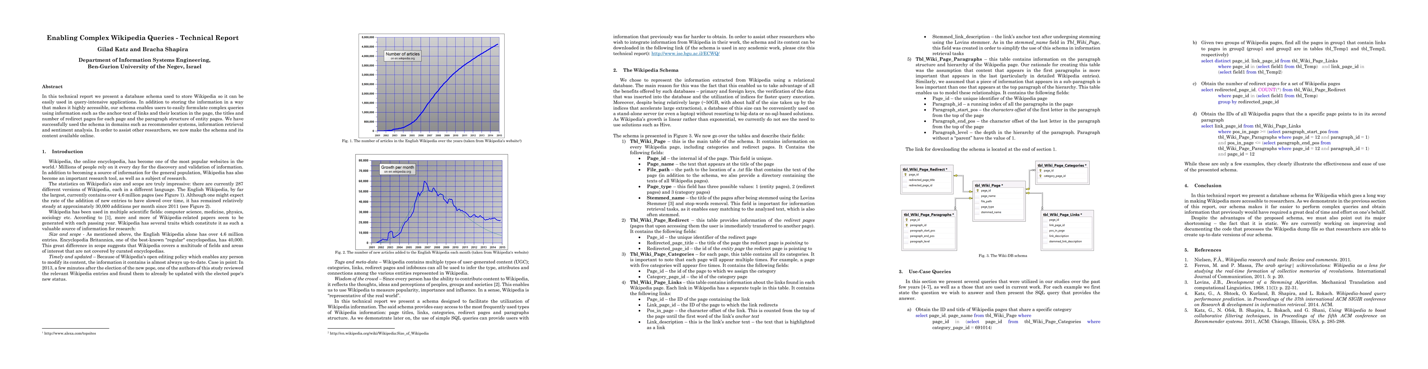 This technical report introduces a database schema designed to efficiently store Wikipedia data for query-intensive applications, allowing users to formulate complex queries based on link anchor-text, redirect pages, and paragraph structures. The schema has been utilized in recommender systems, information retrieval, and sentiment analysis, and is now made publicly available to aid other researchers.