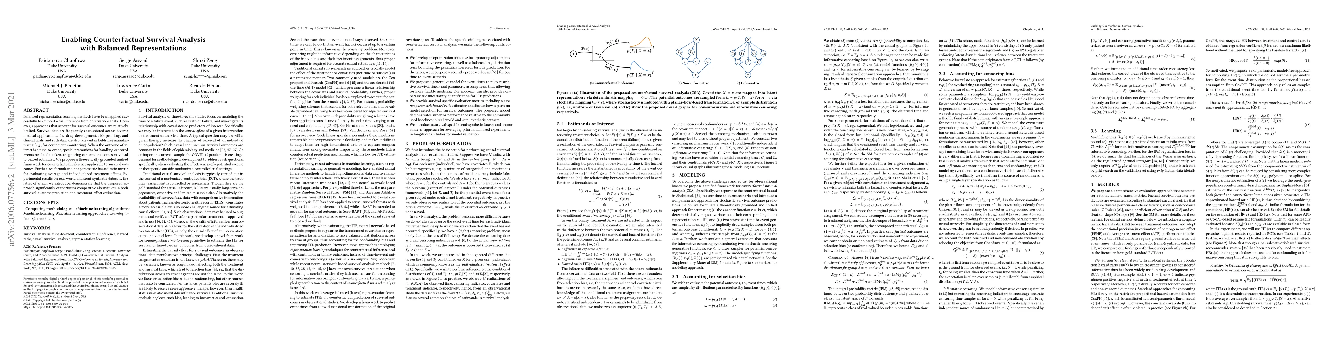 Balanced representation learning methods have been applied successfully to counterfactual inference from observational data. However, approaches that account for survival outcomes are relatively limited. Survival data are frequently encountered across diverse medical applications, i.e., drug development, risk profiling, and clinical trials, and such data are also relevant in fields like manufacturing (e.g., for equipment monitoring). When the outcome of interest is a time-to-event, special precautions for handling censored events need to be taken, as ignoring censored outcomes may lead to biased estimates. We propose a theoretically grounded unified framework for counterfactual inference applicable to survival outcomes. Further, we formulate a nonparametric hazard ratio metric for evaluating average and individualized treatment effects. Experimental results on real-world and semi-synthetic datasets, the latter of which we introduce, demonstrate that the proposed approach significantly outperforms competitive alternatives in both survival-outcome prediction and treatment-effect estimation.