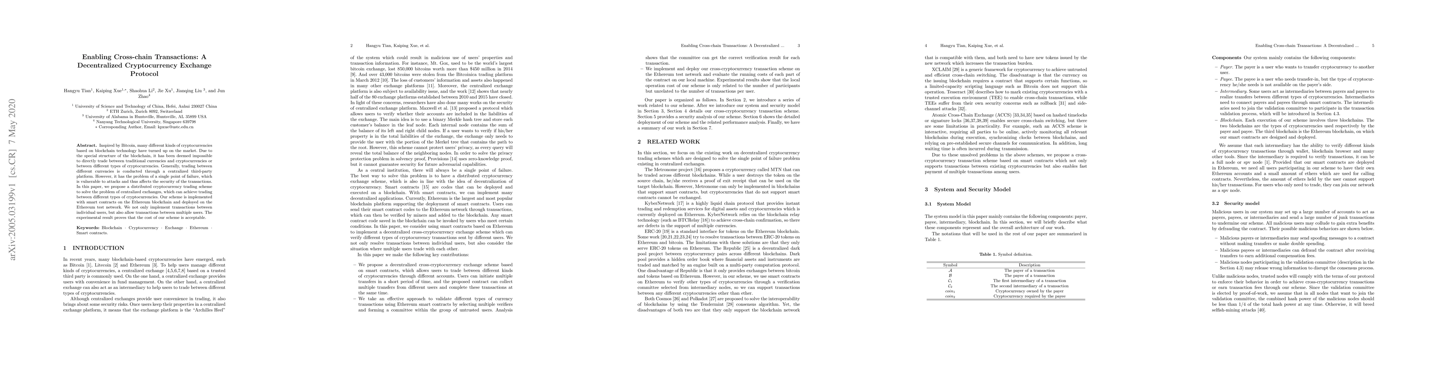 A decentralized cross-cryptocurrency exchange protocol using smart contracts on Ethereum, with single-user and multi-user transaction schemes, and a decentralized transaction validation method.