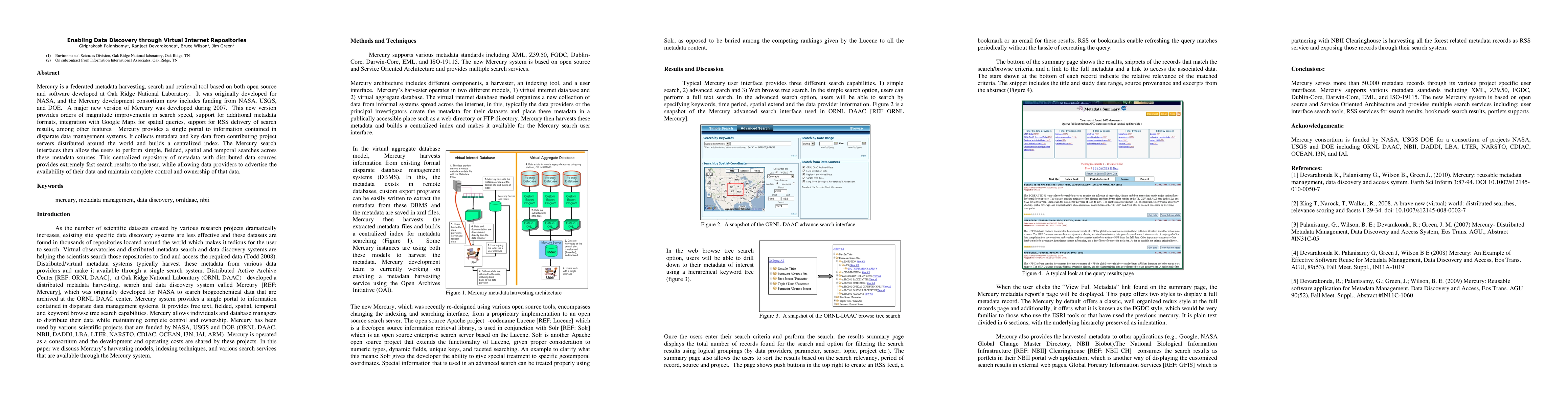 Mercury is a federated metadata harvesting, search and retrieval tool based on both open source and software developed at Oak Ridge National Laboratory. It was originally developed for NASA, and the Mercury development consortium now includes funding from NASA, USGS, and DOE. A major new version of Mercury was developed during 2007. This new version provides orders of magnitude improvements in search speed, support for additional metadata formats, integration with Google Maps for spatial queries, support for RSS delivery of search results, among other features. Mercury provides a single portal to information contained in disparate data management systems. It collects metadata and key data from contributing project servers distributed around the world and builds a centralized index. The Mercury search interfaces then allow the users to perform simple, fielded, spatial and temporal searches across these metadata sources. This centralized repository of metadata with distributed data sources provides extremely fast search results to the user, while allowing data providers to advertise the availability of their data and maintain complete control and ownership of that data.