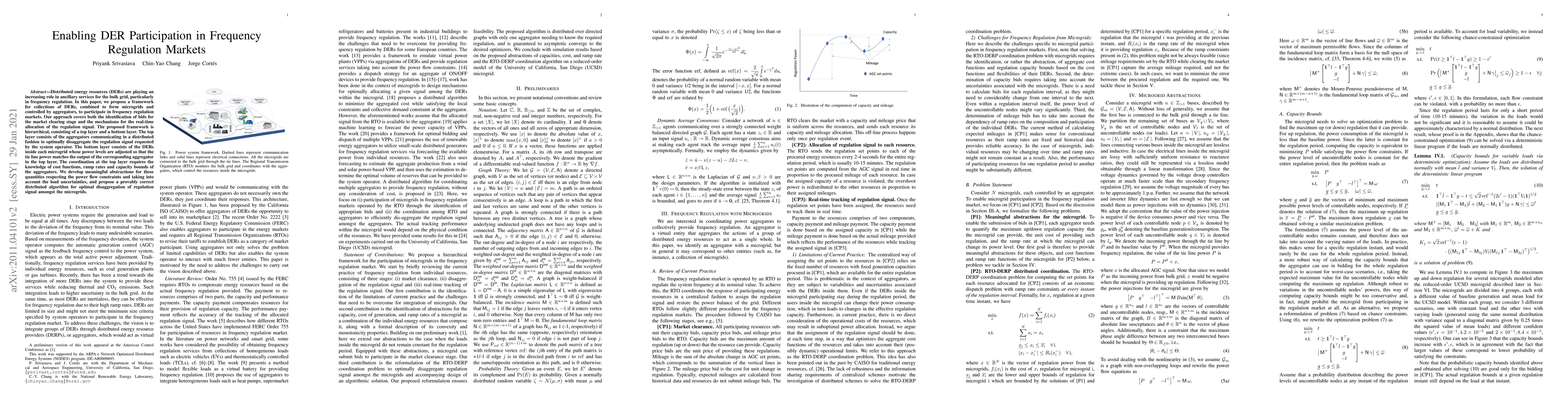 This paper proposes a framework for microgrids of DERs to participate in frequency regulation markets. It features a hierarchical structure with aggregators optimally disaggregating regulation signals at the top layer, and DERs adjusting power levels at the bottom layer. The method involves distributed communication, considering cost functions, ramp rates, capacity bounds, and load uncertainties, ensuring power flow constraints are met.