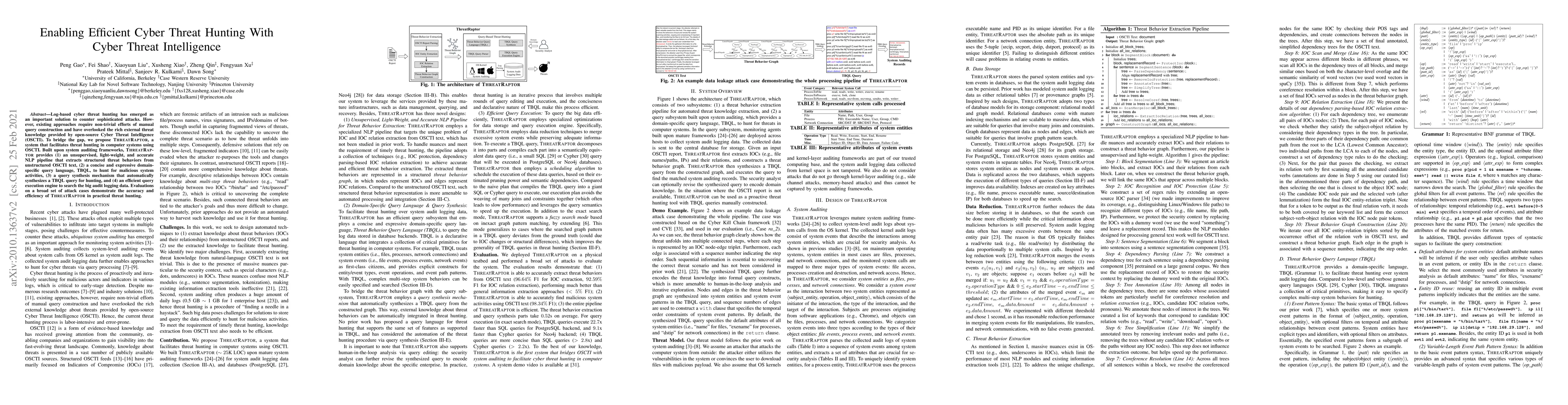 The paper proposes ThreatRaptor, a system to enhance log-based cyber threat hunting by leveraging open-source Cyber Threat Intelligence (OSCTI). It features an NLP pipeline, a domain-specific query language, automatic query synthesis, and an efficient query execution engine, demonstrating improved accuracy and efficiency in practical threat hunting scenarios.