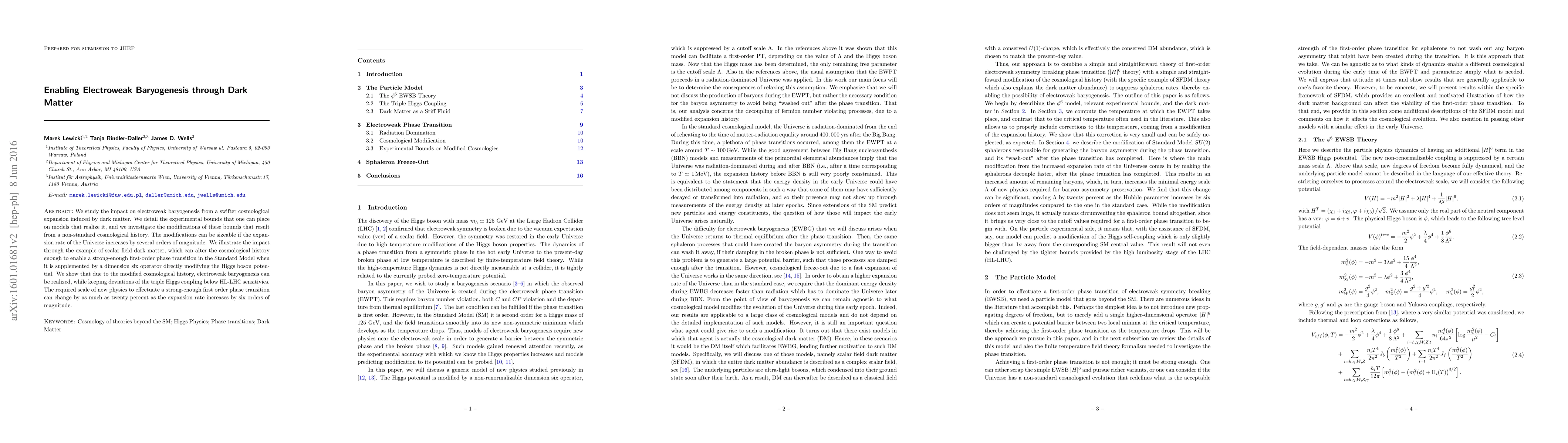This paper explores how dark matter-induced faster cosmological expansion can enable electroweak baryogenesis, detailing the experimental constraints on models that achieve this. It demonstrates that a non-standard cosmological history, particularly with scalar field dark matter, can facilitate a strong first-order phase transition, enabling electroweak baryogenesis while keeping the triple Higgs coupling deviations within current experimental limits.