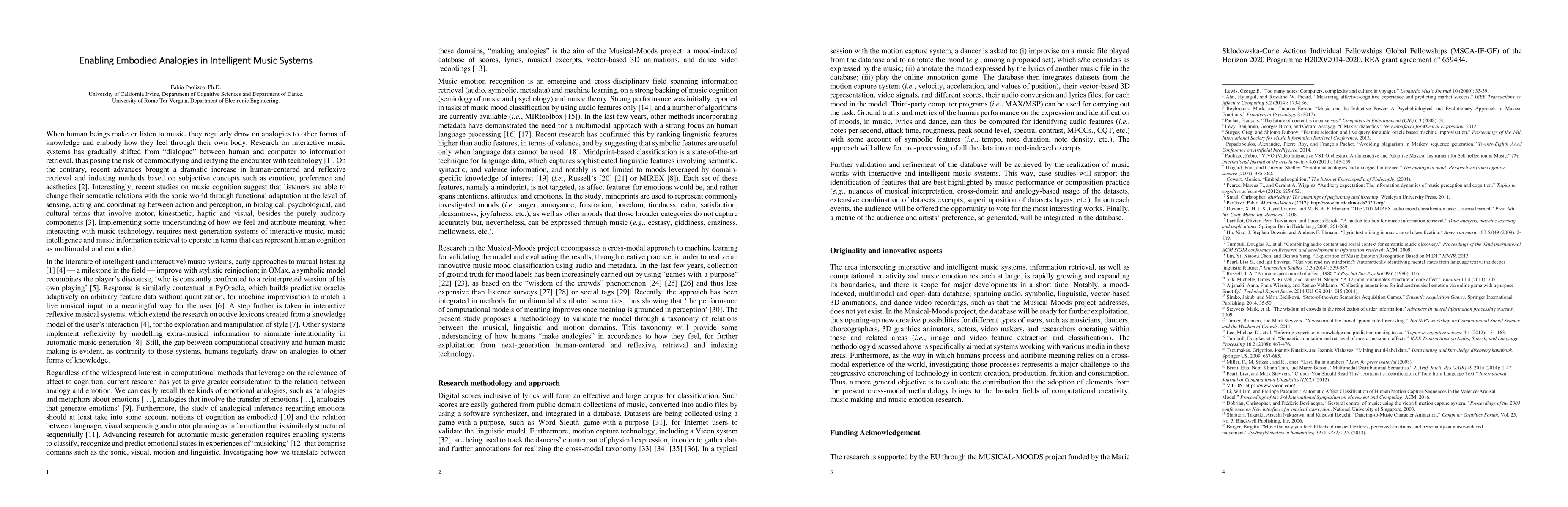 The present methodology is aimed at cross-modal machine learning and uses multidisciplinary tools and methods drawn from a broad range of areas and disciplines, including music, systematic musicology, dance, motion capture, human-computer interaction, computational linguistics and audio signal processing. Main tasks include: (1) adapting wisdom-of-the-crowd approaches to embodiment in music and dance performance to create a dataset of music and music lyrics that covers a variety of emotions, (2) applying audio/language-informed machine learning techniques to that dataset to identify automatically the emotional content of the music and the lyrics, and (3) integrating motion capture data from a Vicon system and dancers performing on that music.