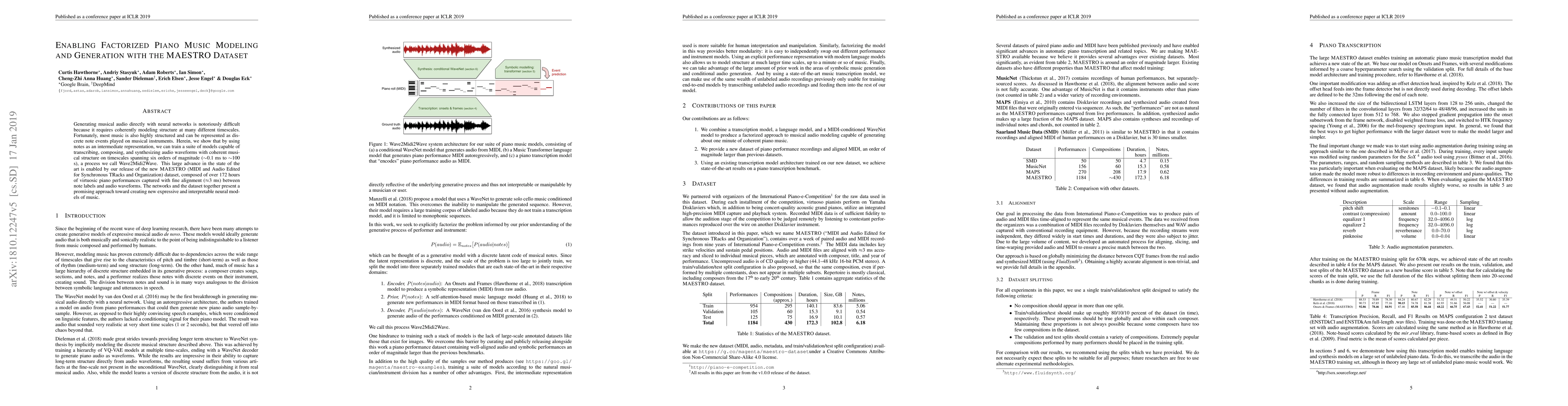 Generating musical audio directly with neural networks is notoriously difficult because it requires coherently modeling structure at many different timescales. Fortunately, most music is also highly structured and can be represented as discrete note events played on musical instruments. Herein, we show that by using notes as an intermediate representation, we can train a suite of models capable of transcribing, composing, and synthesizing audio waveforms with coherent musical structure on timescales spanning six orders of magnitude (~0.1 ms to ~100 s), a process we call Wave2Midi2Wave. This large advance in the state of the art is enabled by our release of the new MAESTRO (MIDI and Audio Edited for Synchronous TRacks and Organization) dataset, composed of over 172 hours of virtuosic piano performances captured with fine alignment (~3 ms) between note labels and audio waveforms. The networks and the dataset together present a promising approach toward creating new expressive and interpretable neural models of music.