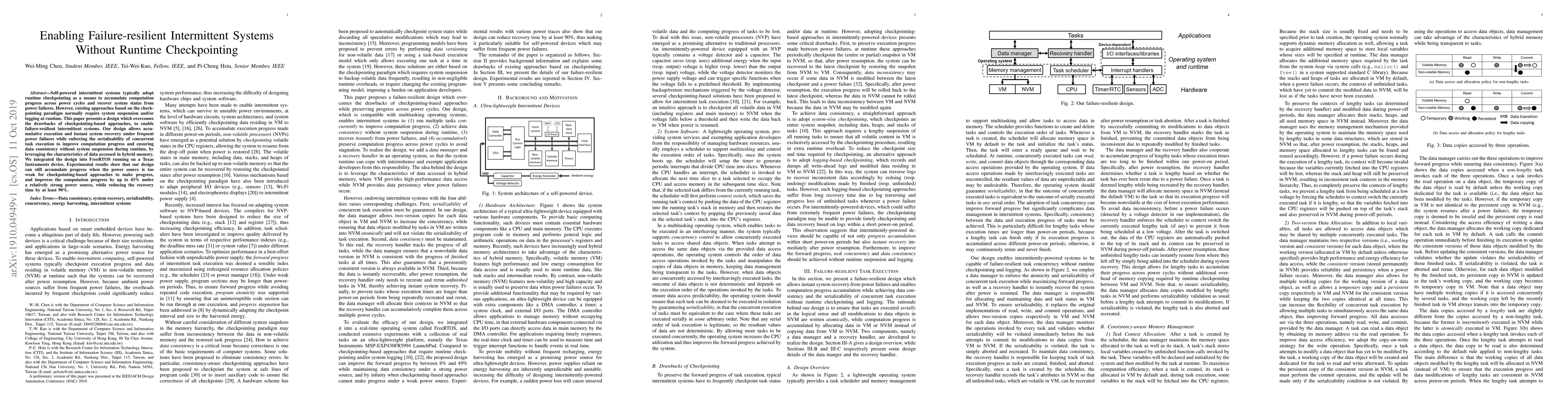 This paper proposes a novel design for failure-resilient intermittent systems that eliminates the need for runtime checkpointing, enabling accumulative execution and instant recovery without system suspension, and improving computation progress and data consistency. Experimental results show significant improvements in computation progress and recovery time.
