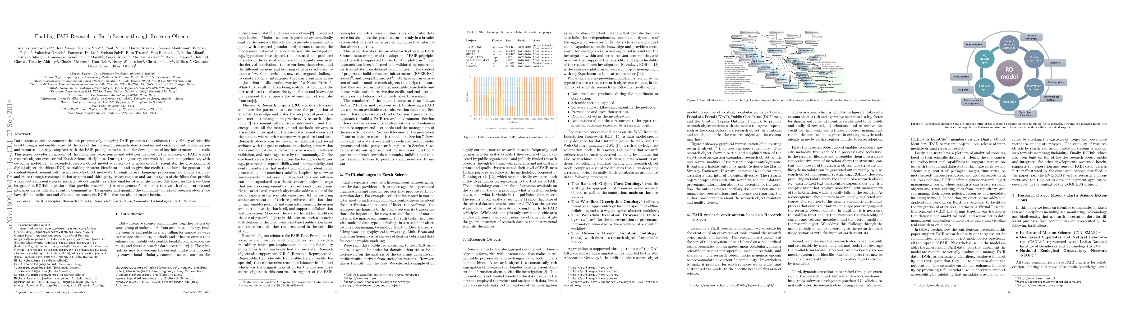 This paper explores the adoption of FAIR principles in Earth Science through the use of research objects, detailing challenges, solutions, and outcomes such as an extended research object model, DOI provisioning, and metadata generation. The results are integrated into ROHub, a platform supporting research object management, with indicators defined to monitor community uptake.