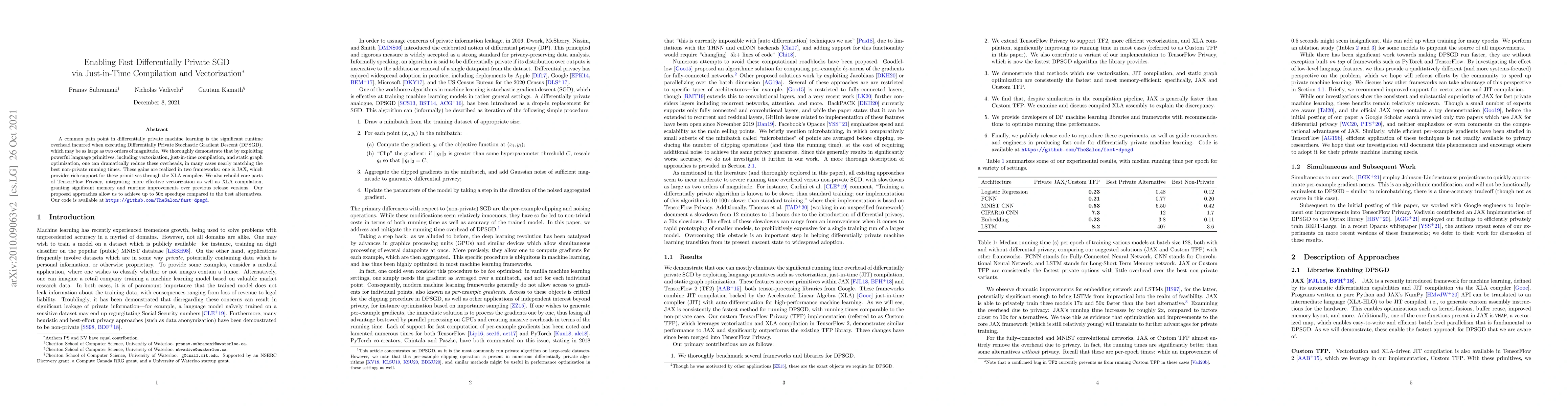 This paper presents techniques to significantly reduce the runtime overhead of Differentially Private Stochastic Gradient Descent (DPSGD) using vectorization, just-in-time compilation, and static graph optimization. The authors achieve up to 50x speedups in two frameworks, JAX and TensorFlow, leveraging the XLA compiler and TensorFlow Privacy enhancements.