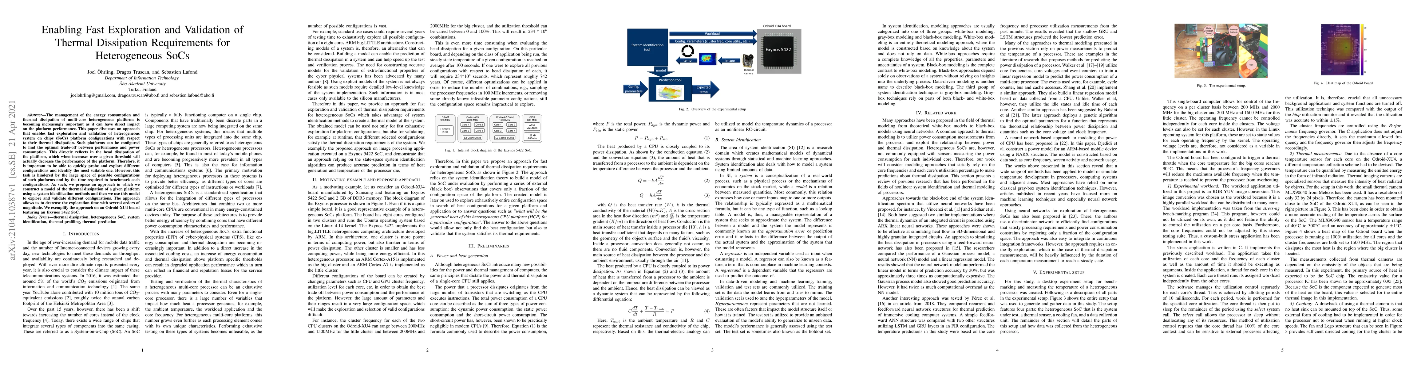 The management of the energy consumption and thermal dissipation of multi-core heterogeneous platforms is becoming increasingly important as it can have direct impact on the platform performance. This paper discusses an approach that enables fast exploration and validation of heterogeneous system on chips (SoCs) platform configurations with respect to their thermal dissipation. Such platforms can be configured to find the optimal trade-off between performance and power consumption. This directly reflects in the head dissipation of the platform, which when increases over a given threshold will actually decrease the performance of the platform. Therefore, it is important to be able to quickly probe and explore different configurations and identify the most suitable one. However, this task is hindered by the large space of possible configurations of such platforms and by the time required to benchmark each configurations. As such, we propose an approach in which we construct a model of the thermal dissipation of a given platform using a system identification methods and then we use this model to explore and validate different configurations. The approach allows us to decrease the exploration time with several orders of magnitude. We exemplify the approach on an Odroid-XU4 board featuring an Exynos 5422 SoC.