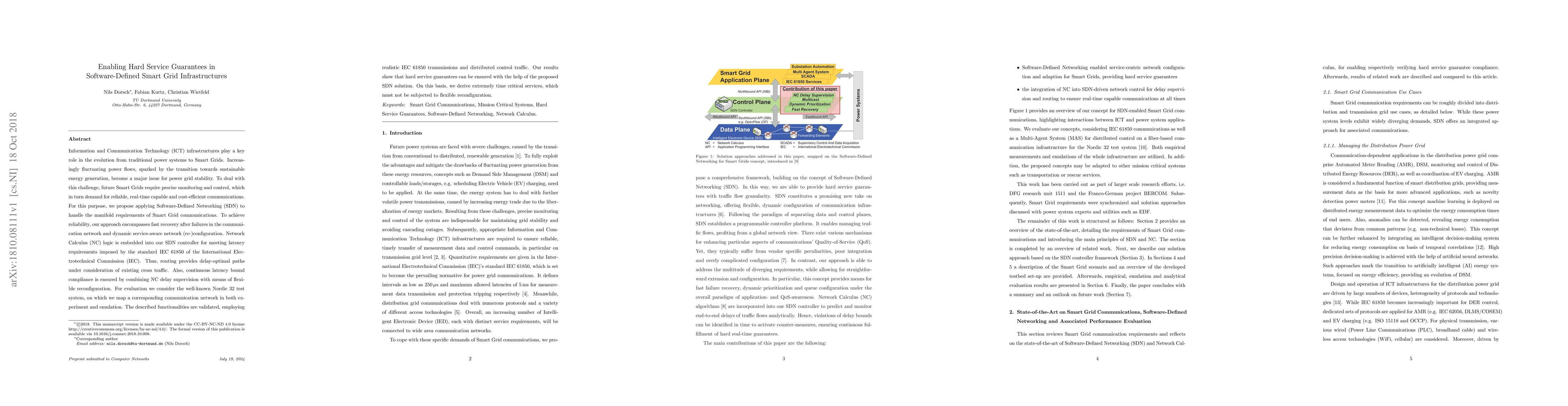 Information and Communication Technology (ICT) infrastructures play a key role in the evolution from traditional power systems to Smart Grids. Increasingly fluctuating power flows, sparked by the transition towards sustainable energy generation, become a major issue for power grid stability. To deal with this challenge, future Smart Grids require precise monitoring and control, which in turn demand for reliable, real-time capable and cost-efficient communications. For this purpose, we propose applying Software-Defined Networking (SDN) to handle the manifold requirements of Smart Grid communications. To achieve reliability, our approach encompasses fast recovery after failures in the communication network and dynamic service-aware network (re-)configuration. Network Calculus (NC) logic is embedded into our SDN controller for meeting latency requirements imposed by the standard IEC 61850 of the International Electrotechnical Committee (IEC). Thus, routing provides delay-optimal paths under consideration of existing cross traffic. Also, continuous latency bound compliance is ensured by combining NC delay supervision with means of flexible reconfiguration. For evaluation we consider the well-known Nordic 32 test system, on which we map a corresponding communication network in both experiment and emulation. The described functionalities are validated, employing realistic IEC 61850 transmissions and distributed control traffic. Our results show that hard service guarantees can be ensured with the help of the proposed SDN solution. On this basis, we derive extremely time critical services, which must not be subjected to flexible reconfiguration.