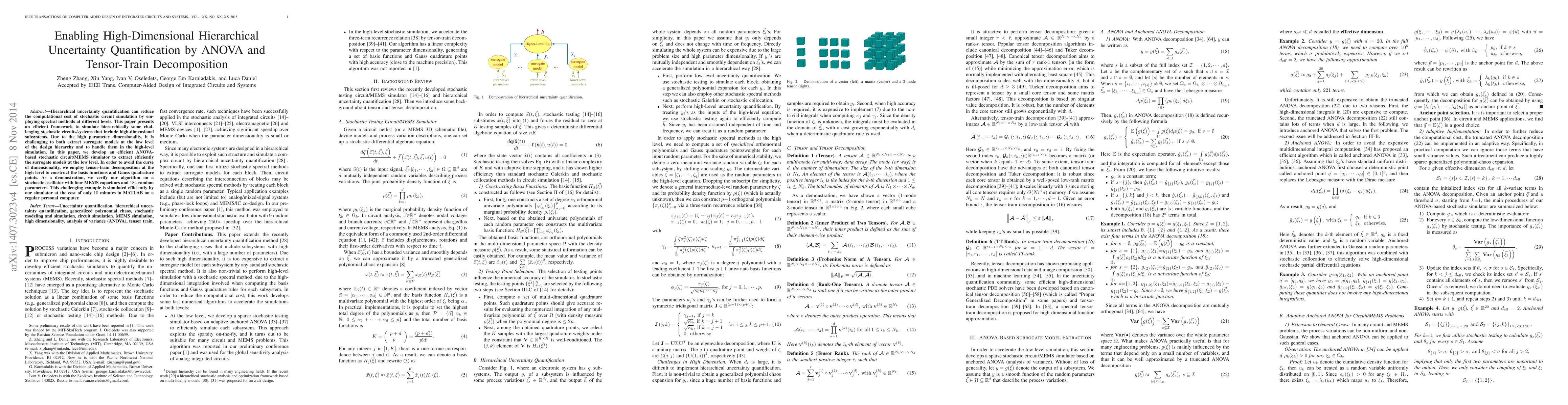 This paper proposes an efficient framework for hierarchical uncertainty quantification using ANOVA and tensor-train decomposition to simulate high-dimensional stochastic circuits. It demonstrates the method's effectiveness on a complex stochastic oscillator with 184 random parameters, achieving a simulation time of just 10 minutes on a standard PC.
