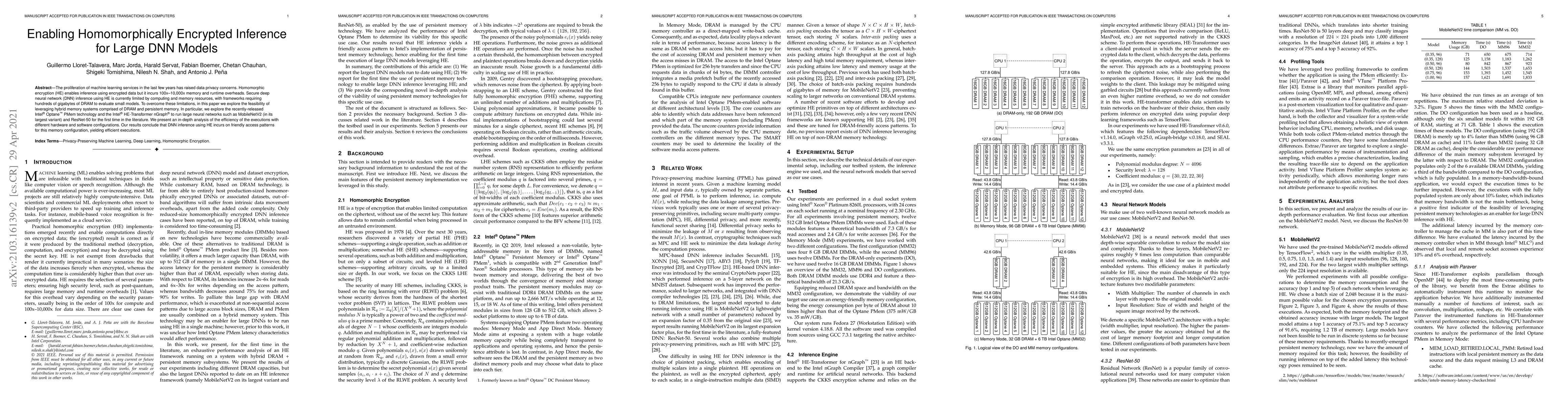 This paper investigates the feasibility of enabling homomorphically encrypted inference for large deep neural networks using hybrid memory systems, specifically Intel Optane PMem and Intel HE-Transformer nGraph. The study demonstrates efficient execution of models like MobileNetV2 and ResNet-50, showing that hybrid memory configurations can mitigate the significant memory and runtime overheads typically associated with homomorphic encryption.