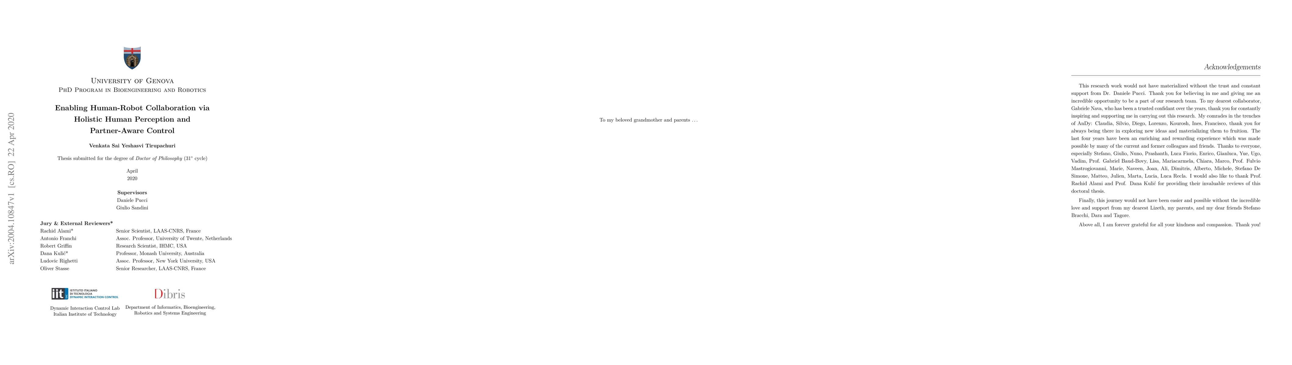 As robotic technology advances, the barriers to the coexistence of humans and robots are slowly coming down. Application domains like elderly care, collaborative manufacturing, collaborative manipulation, etc., are considered the need of the hour, and progress in robotics holds the potential to address many societal challenges. The future socio-technical systems constitute of blended workforce with a symbiotic relationship between human and robot partners working collaboratively. This thesis attempts to address some of the research challenges in enabling human-robot collaboration. In particular, the challenge of a holistic perception of a human partner to continuously communicate his intentions and needs in real-time to a robot partner is crucial for the successful realization of a collaborative task. Towards that end, we present a holistic human perception framework for real-time monitoring of whole-body human motion and dynamics. On the other hand, the challenge of leveraging assistance from a human partner will lead to improved human-robot collaboration. In this direction, we attempt at methodically defining what constitutes assistance from a human partner and propose partner-aware robot control strategies to endow robots with the capacity to meaningfully engage in a collaborative task.