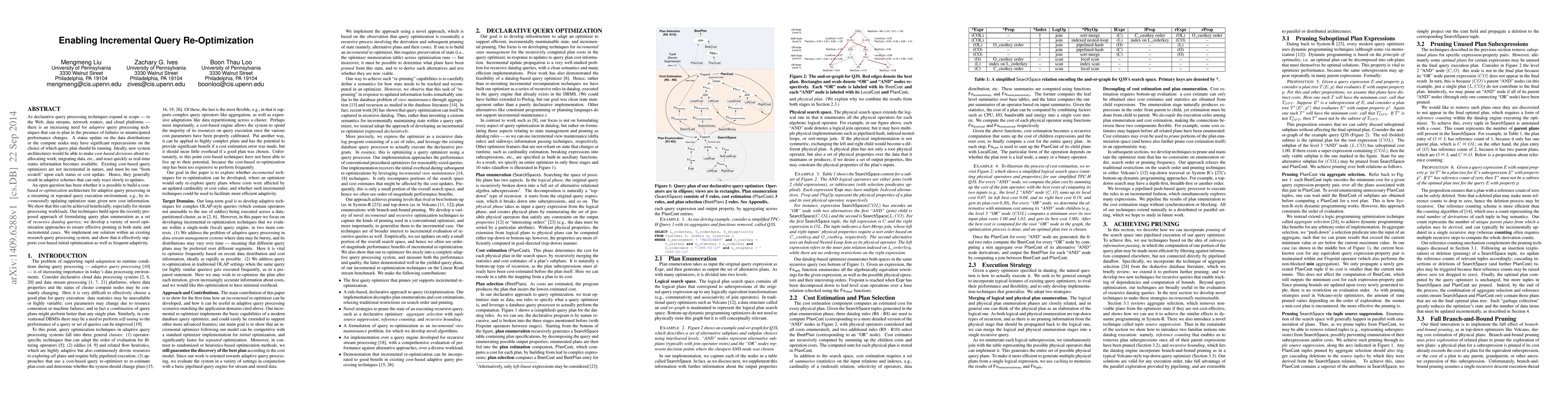 This paper presents techniques for enabling incremental query re-optimization in adaptive query processing systems, especially for stream processing workloads. It introduces novel optimization methods for pruning and efficiently updating query plans based on real-time status information, demonstrating effective support for both initial and adaptive optimization within a research query processing system.