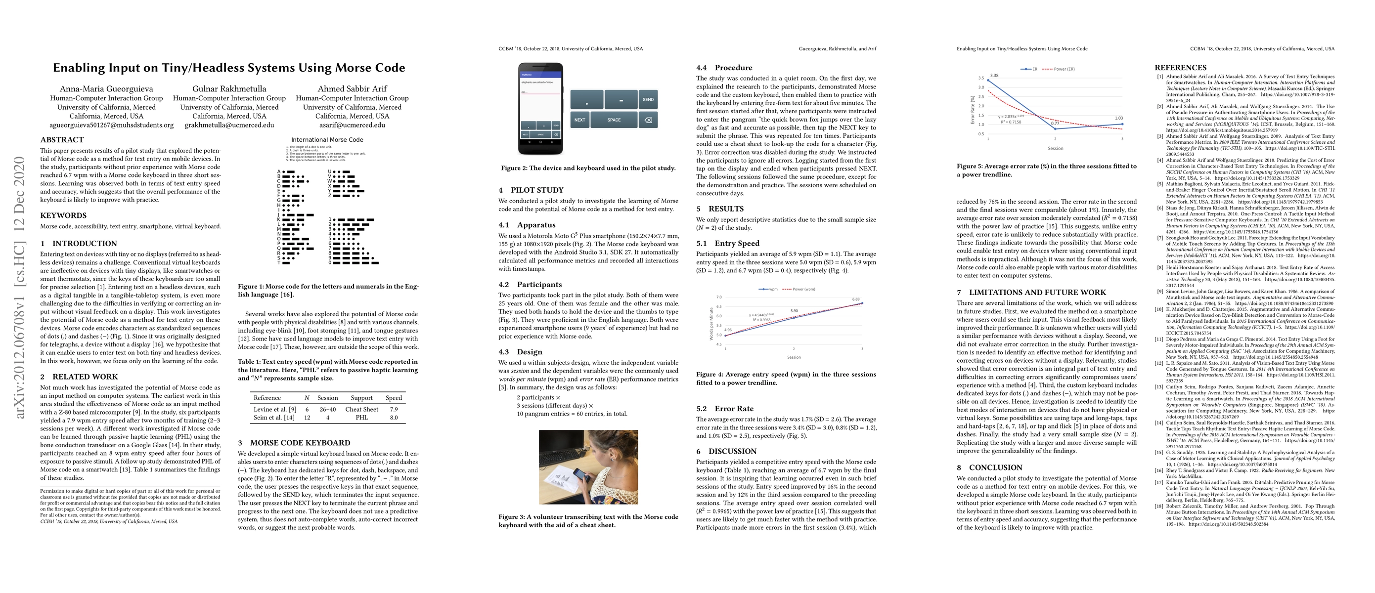 This paper presents results of a pilot study that explored the potential of Morse code as a method for text entry on mobile devices. In the study, participants without prior experience with Morse code reached 6.7 wpm with a Morse code keyboard in three short sessions. Learning was observed both in terms of text entry speed and accuracy, which suggests that the overall performance of the keyboard is likely to improve with practice.