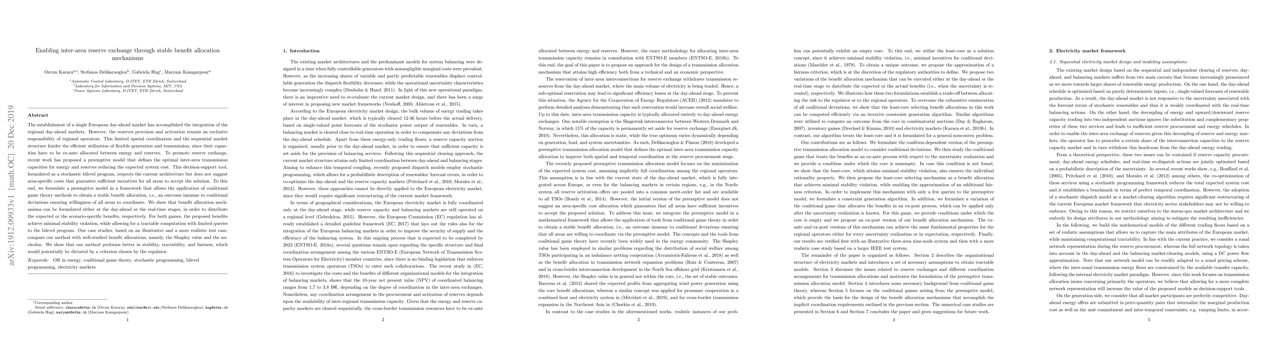 This paper proposes a preemptive model to enable inter-area reserve exchange by formulating a stable benefit allocation mechanism using coalitional game theory. The method ensures minimal stability violation and is more effective in stability, tractability, and fairness compared to traditional allocations like the Shapley value and nucleolus.