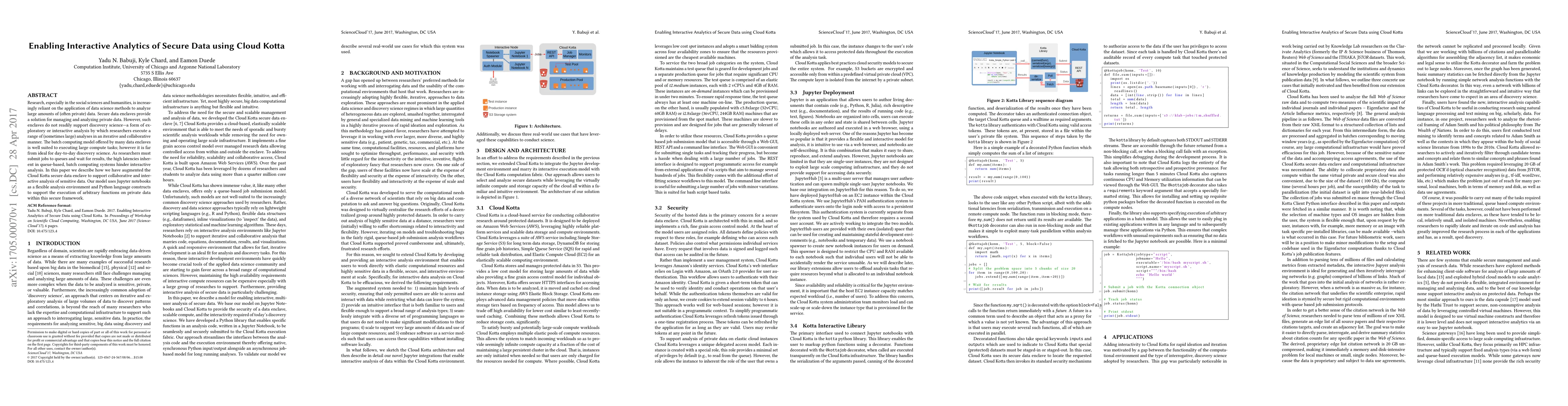 This paper describes enhancements to Cloud Kotta to enable interactive analytics of secure, private data, using Jupyter notebooks and Python for flexible, collaborative, and iterative analysis, addressing the limitations of traditional batch computing models.