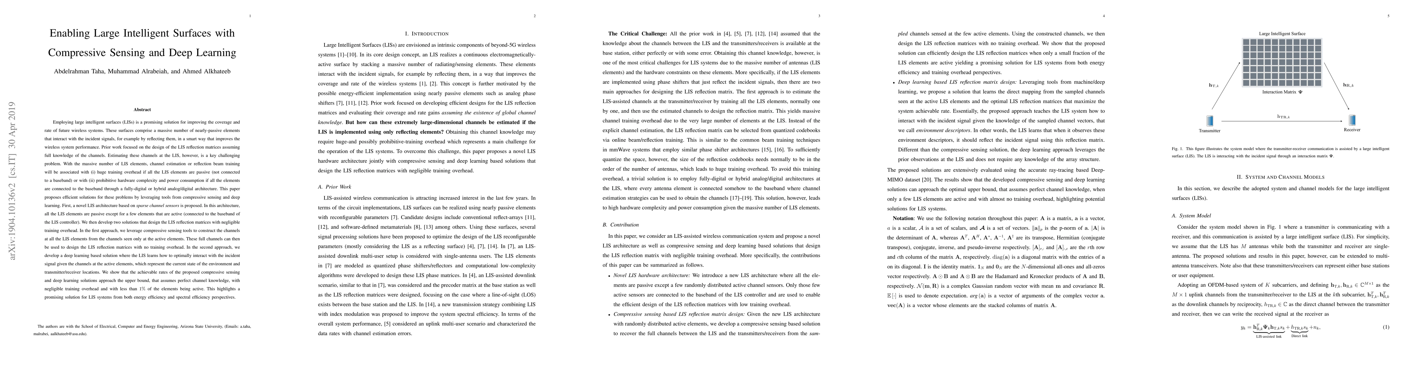 Employing large intelligent surfaces (LISs) is a promising solution for improving the coverage and rate of future wireless systems. These surfaces comprise a massive number of nearly-passive elements that interact with the incident signals, for example by reflecting them, in a smart way that improves the wireless system performance. Prior work focused on the design of the LIS reflection matrices assuming full knowledge of the channels. Estimating these channels at the LIS, however, is a key challenging problem, and is associated with large training overhead given the massive number of LIS elements. This paper proposes efficient solutions for these problems by leveraging tools from compressive sensing and deep learning. First, a novel LIS architecture based on sparse channel sensors is proposed. In this architecture, all the LIS elements are passive except for a few elements that are active (connected to the baseband of the LIS controller). We then develop two solutions that design the LIS reflection matrices with negligible training overhead. In the first approach, we leverage compressive sensing tools to construct the channels at all the LIS elements from the channels seen only at the active elements. These full channels can then be used to design the LIS reflection matrices with no training overhead. In the second approach, we develop a deep learning based solution where the LIS learns how to optimally interact with the incident signal given the channels at the active elements, which represent the current state of the environment and transmitter/receiver locations. We show that the achievable rates of the proposed compressive sensing and deep learning solutions approach the upper bound, that assumes perfect channel knowledge, with negligible training overhead and with less than 1% of the elements being active.