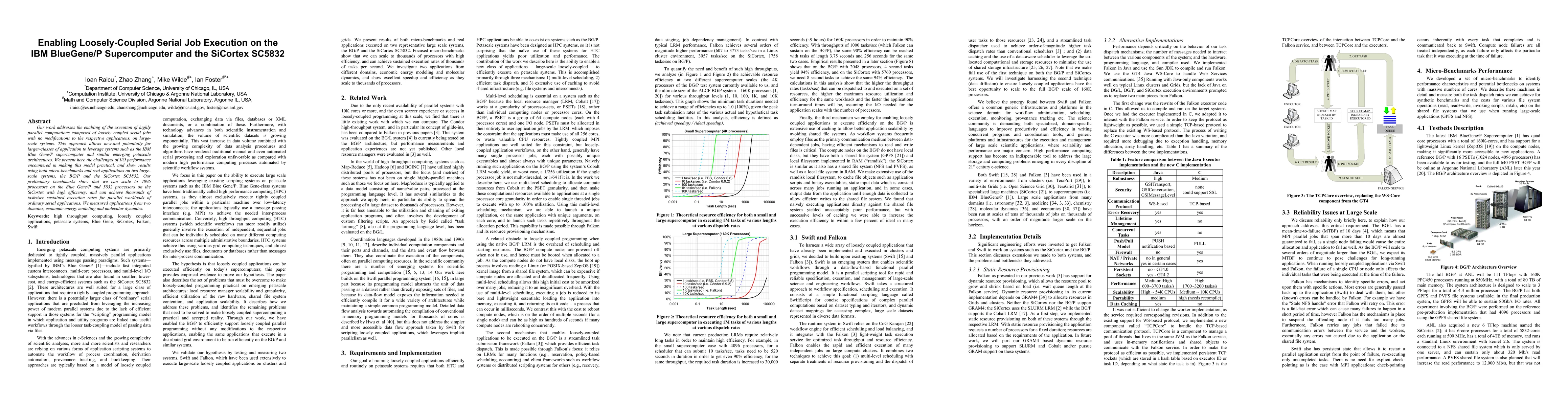 This paper presents a method to execute loosely coupled serial jobs on large-scale supercomputers like IBM BlueGene/P and SiCortex SC5832 without modifying applications. It addresses I/O performance challenges and demonstrates scalability and efficiency using micro-benchmarks and real applications, achieving thousands of tasks/sec for parallel workloads.