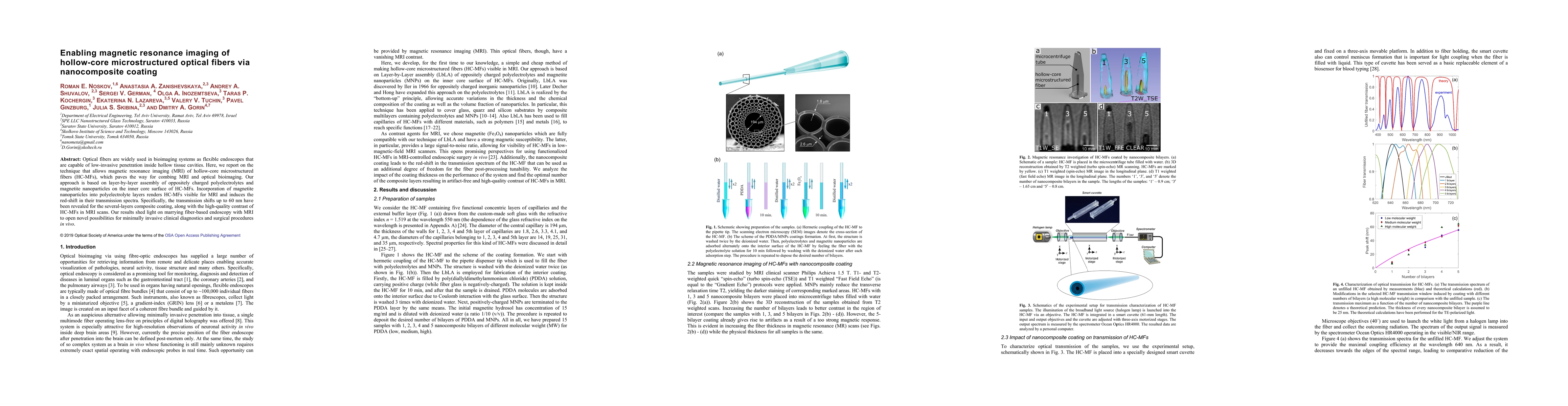 This paper presents a method for enabling MRI of hollow-core microstructured optical fibers using nanocomposite coating, combining MRI and optical bioimaging. The technique involves Layer-by-Layer assembly of magnetite nanoparticles and polyelectrolytes, resulting in visible MRI contrast and a red-shift in transmission spectra, paving the way for advanced minimally invasive diagnostics.