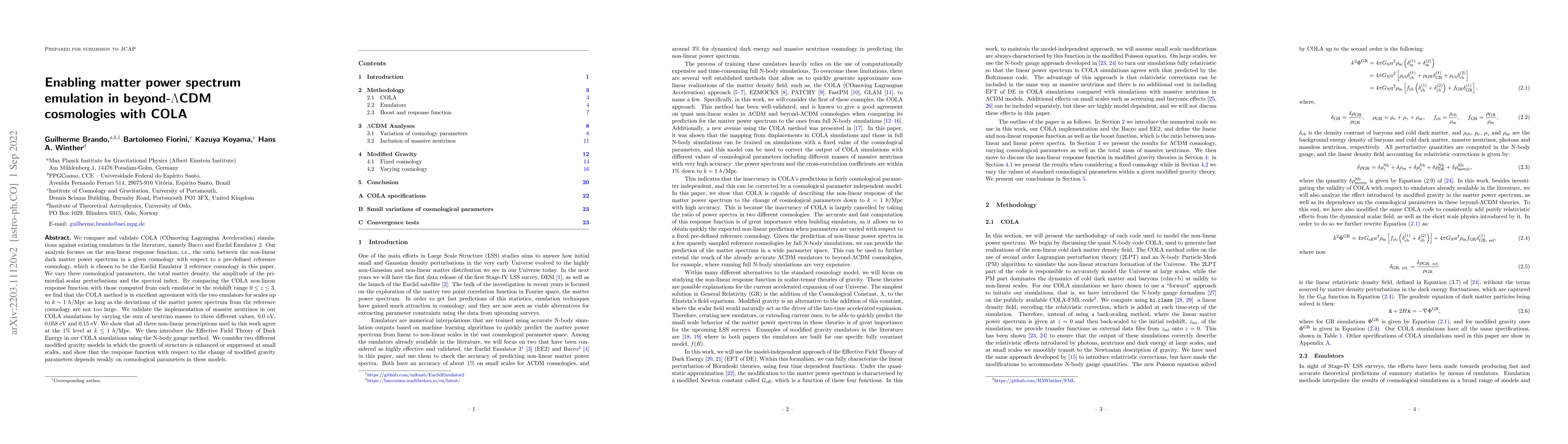 This paper validates COLA simulations against Bacco and Euclid Emulator 2 for beyond-$\Lambda$CDM cosmologies, showing excellent agreement for non-linear dark matter power spectrum ratios up to $k \sim 1 \ h$/Mpc. It also validates the implementation of massive neutrinos and explores modified gravity models using the Effective Field Theory of Dark Energy.