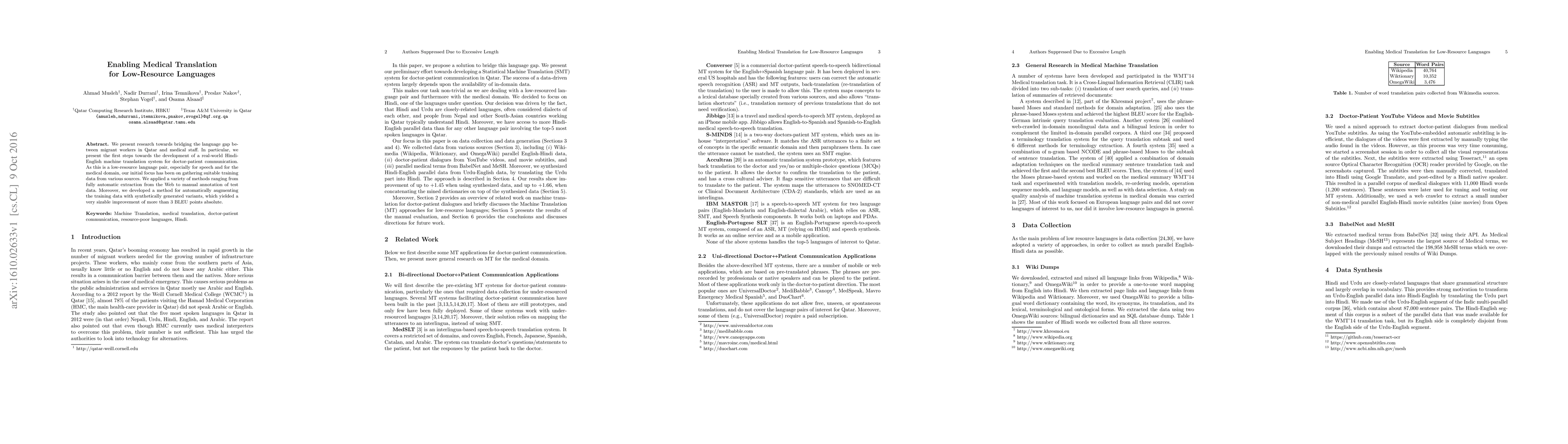 We present research towards bridging the language gap between migrant workers in Qatar and medical staff. In particular, we present the first steps towards the development of a real-world Hindi-English machine translation system for doctor-patient communication. As this is a low-resource language pair, especially for speech and for the medical domain, our initial focus has been on gathering suitable training data from various sources. We applied a variety of methods ranging from fully automatic extraction from the Web to manual annotation of test data. Moreover, we developed a method for automatically augmenting the training data with synthetically generated variants, which yielded a very sizable improvement of more than 3 BLEU points absolute.