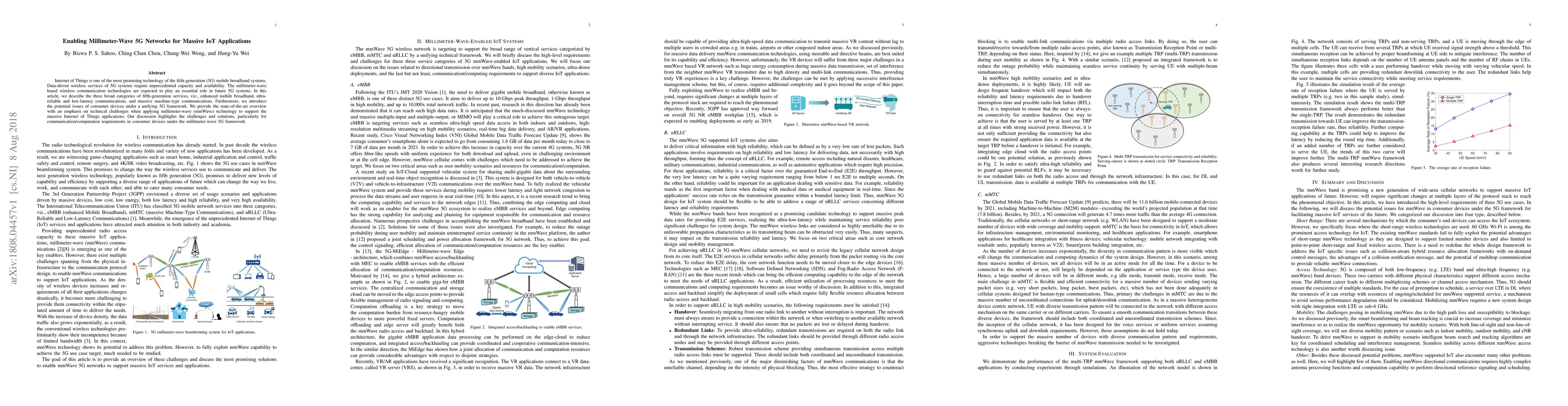 This paper explores the role of millimeter-wave (mmWave) technology in enabling 5G networks for massive IoT applications, focusing on the three main 5G service categories: enhanced mobile broadband, ultra-reliable low-latency communications, and massive machine-type communications. It discusses the technical challenges and potential solutions for integrating mmWave technology to support IoT under the 5G framework.
