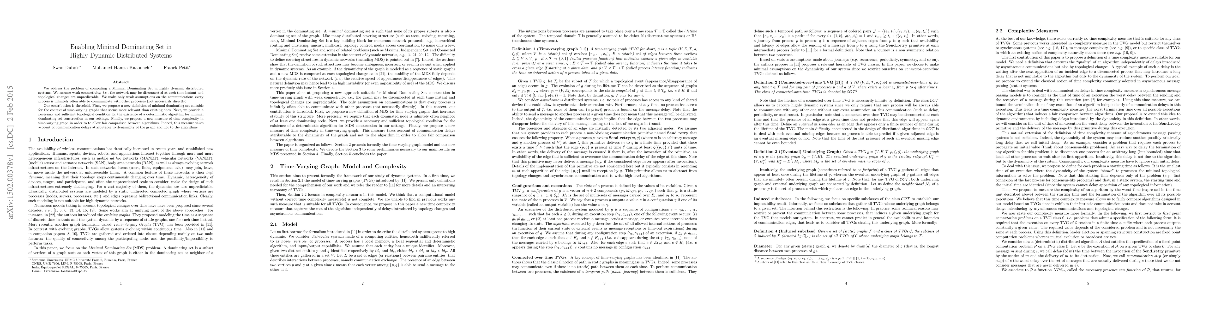This paper proposes a new definition of minimal dominating set for dynamic distributed systems, establishes a necessary and sufficient condition for deterministic algorithm existence, and introduces a new time complexity measure that accounts for the dynamic nature of the network. The focus is on weak connectivity and unpredictable topological changes.