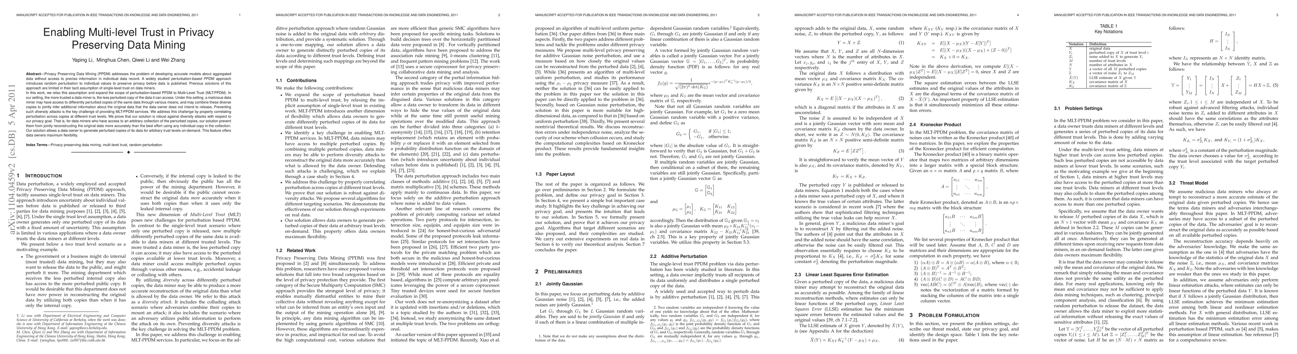 This research paper develops a new approach to protect privacy in data mining, called Multi-Level Trust PPDM, which ensures that trusted miners have access to less perturbed data than less trustworthy ones, preventing diversity attacks and ensuring the confidentiality of individual records.