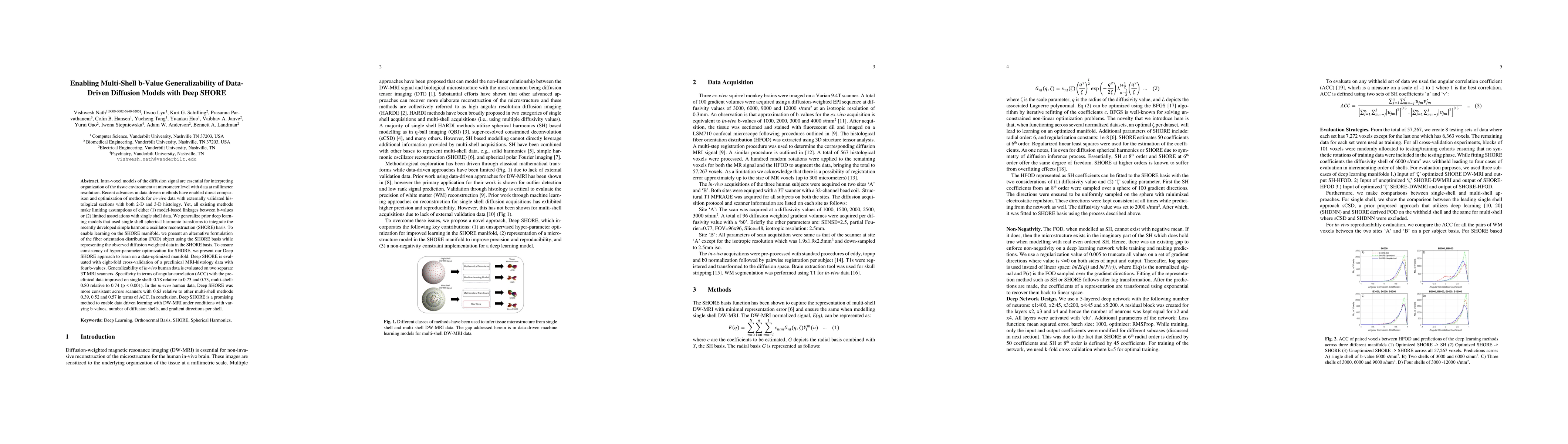 Intra-voxel models of the diffusion signal are essential for interpreting organization of the tissue environment at micrometer level with data at millimeter resolution. Recent advances in data driven methods have enabled direct compari-son and optimization of methods for in-vivo data with externally validated histological sections with both 2-D and 3-D histology. Yet, all existing methods make limiting assumptions of either (1) model-based linkages between b-values or (2) limited associations with single shell data. We generalize prior deep learning models that used single shell spherical harmonic transforms to integrate the re-cently developed simple harmonic oscillator reconstruction (SHORE) basis. To enable learning on the SHORE manifold, we present an alternative formulation of the fiber orientation distribution (FOD) object using the SHORE basis while rep-resenting the observed diffusion weighted data in the SHORE basis. To ensure consistency of hyper-parameter optimization for SHORE, we present our Deep SHORE approach to learn on a data-optimized manifold. Deep SHORE is evalu-ated with eight-fold cross-validation of a preclinical MRI-histology data with four b-values. Generalizability of in-vivo human data is evaluated on two separate 3T MRI scanners. Specificity in terms of angular correlation (ACC) with the preclinical data improved on single shell: 0.78 relative to 0.73 and 0.73, multi-shell: 0.80 relative to 0.74 (p < 0.001). In the in-vivo human data, Deep SHORE was more consistent across scanners with 0.63 relative to other multi-shell methods 0.39, 0.52 and 0.57 in terms of ACC. In conclusion, Deep SHORE is a promising method to enable data driven learning with DW-MRI under conditions with varying b-values, number of diffusion shells, and gradient directions per shell.