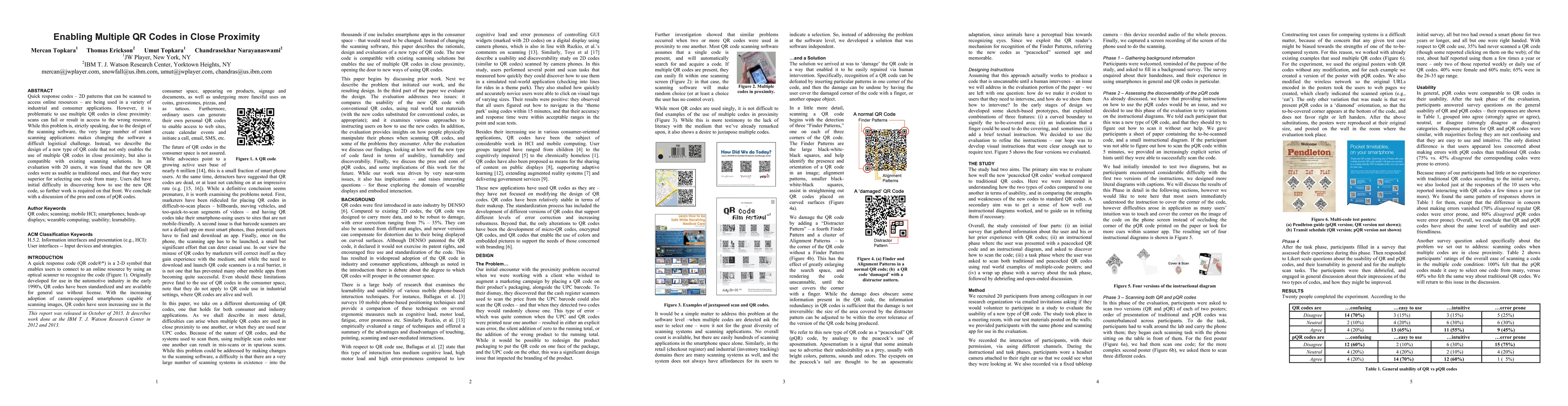 This paper introduces a new type of QR code designed to enable multiple QR codes in close proximity without requiring changes to existing scanning software. Evaluations showed the new QR codes were as usable as traditional ones but better for selecting specific codes, though users initially struggled to discover their use.