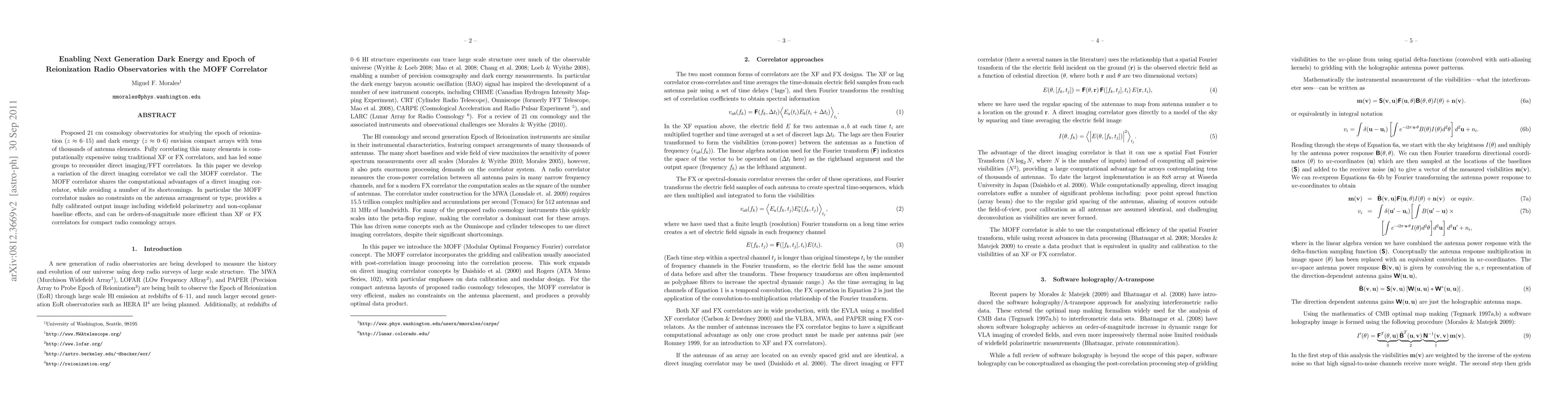 This paper introduces the MOFF correlator, a novel approach to correlating data from large-scale radio observatories for studying the epoch of reionization and dark energy. It offers computational efficiency and flexibility in antenna arrangement while providing fully calibrated output images.