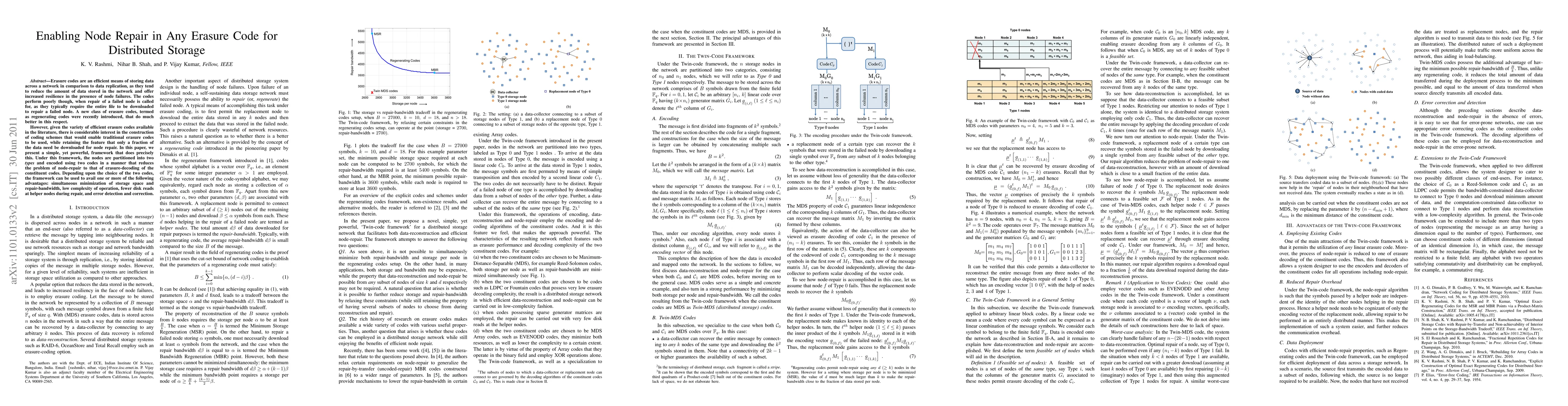 This paper introduces a framework to enable efficient node repair in traditional erasure codes by partitioning nodes into two types and using two different codes, allowing for minimized storage and repair bandwidth, lower operational complexity, fewer disk reads during repair, and error detection and correction.