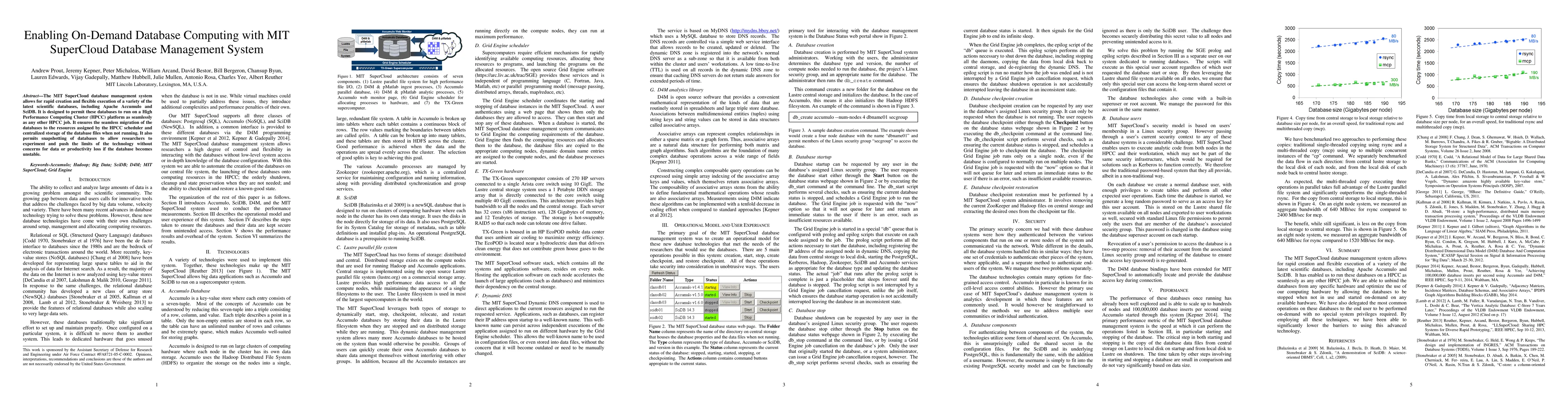 The MIT SuperCloud database management system allows for rapid creation and flexible execution of a variety of the latest scientific databases, including Apache Accumulo and SciDB. It is designed to permit these databases to run on a High Performance Computing Cluster (HPCC) platform as seamlessly as any other HPCC job. It ensures the seamless migration of the databases to the resources assigned by the HPCC scheduler and centralized storage of the database files when not running. It also permits snapshotting of databases to allow researchers to experiment and push the limits of the technology without concerns for data or productivity loss if the database becomes unstable.