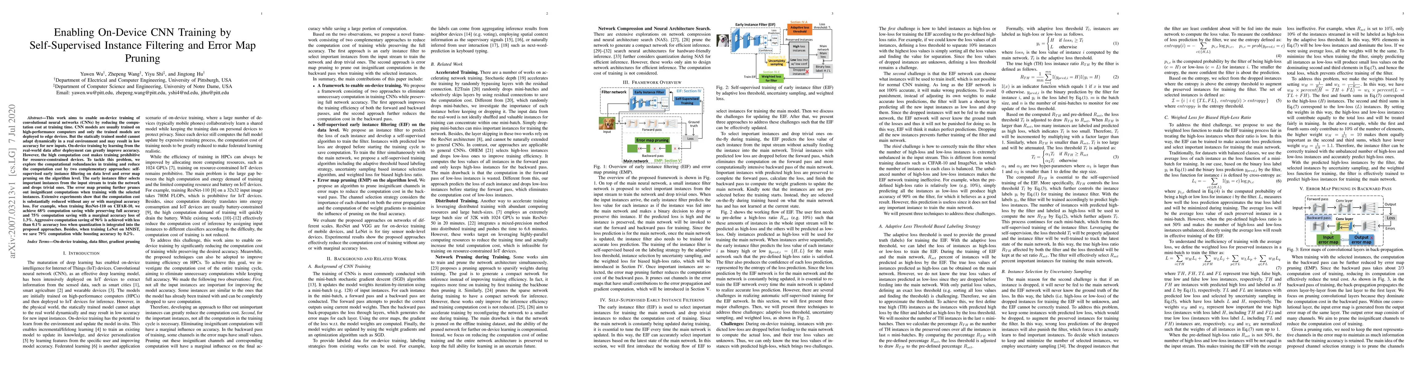 This work aims to enable on-device training of convolutional neural networks (CNNs) by reducing the computation cost at training time. CNN models are usually trained on high-performance computers and only the trained models are deployed to edge devices. But the statically trained model cannot adapt dynamically in a real environment and may result in low accuracy for new inputs. On-device training by learning from the real-world data after deployment can greatly improve accuracy. However, the high computation cost makes training prohibitive for resource-constrained devices. To tackle this problem, we explore the computational redundancies in training and reduce the computation cost by two complementary approaches: self-supervised early instance filtering on data level and error map pruning on the algorithm level. The early instance filter selects important instances from the input stream to train the network and drops trivial ones. The error map pruning further prunes out insignificant computations when training with the selected instances. Extensive experiments show that the computation cost is substantially reduced without any or with marginal accuracy loss. For example, when training ResNet-110 on CIFAR-10, we achieve 68% computation saving while preserving full accuracy and 75% computation saving with a marginal accuracy loss of 1.3%. Aggressive computation saving of 96% is achieved with less than 0.1% accuracy loss when quantization is integrated into the proposed approaches. Besides, when training LeNet on MNIST, we save 79% computation while boosting accuracy by 0.2%.