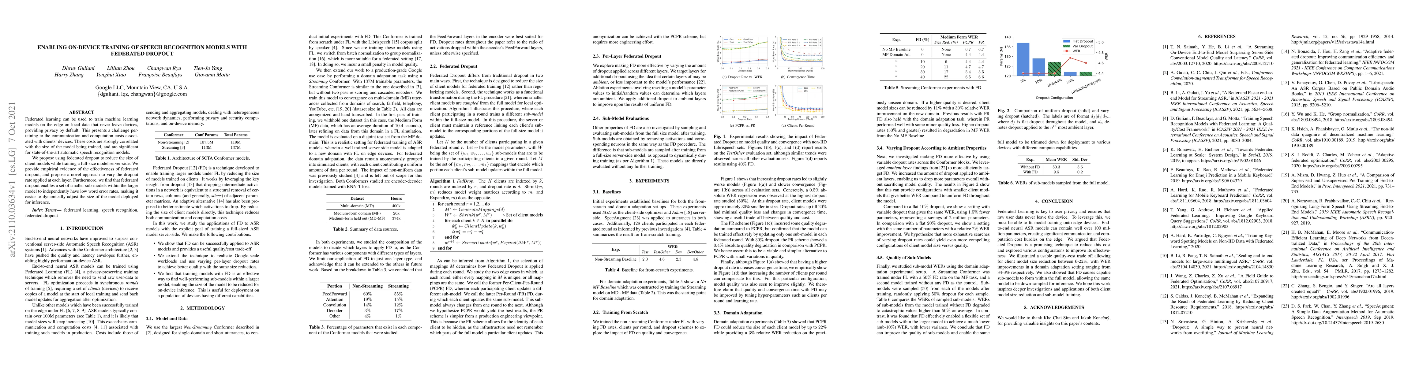 This paper proposes federated dropout to enable on-device training of speech recognition models by reducing the size of client models while maintaining a full-size server-side model. The approach dynamically adjusts dropout rates at each layer, demonstrating effective reduction in communication and computation costs while maintaining low word error rates.