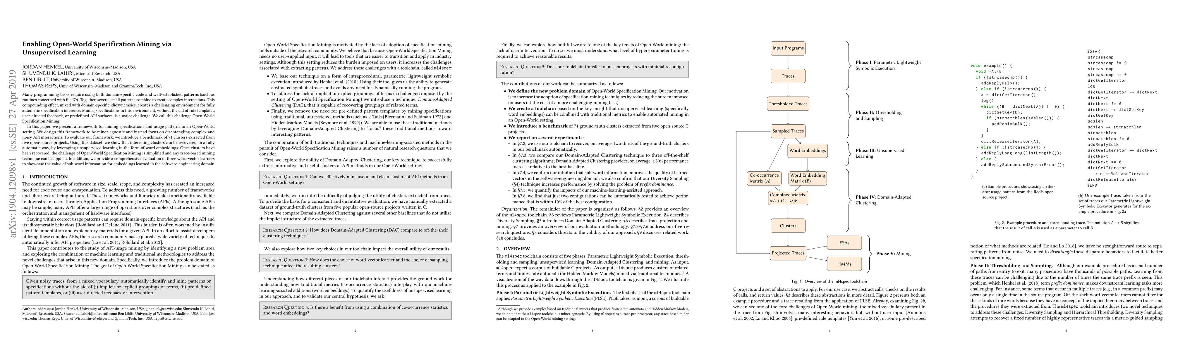This paper proposes a framework for automatically mining specifications and usage patterns in open-world environments without predefined rules or feedback, leveraging unsupervised learning and word embeddings. The framework's effectiveness is demonstrated through a benchmark dataset of clusters from open-source projects, showing successful recovery of complex interactions.