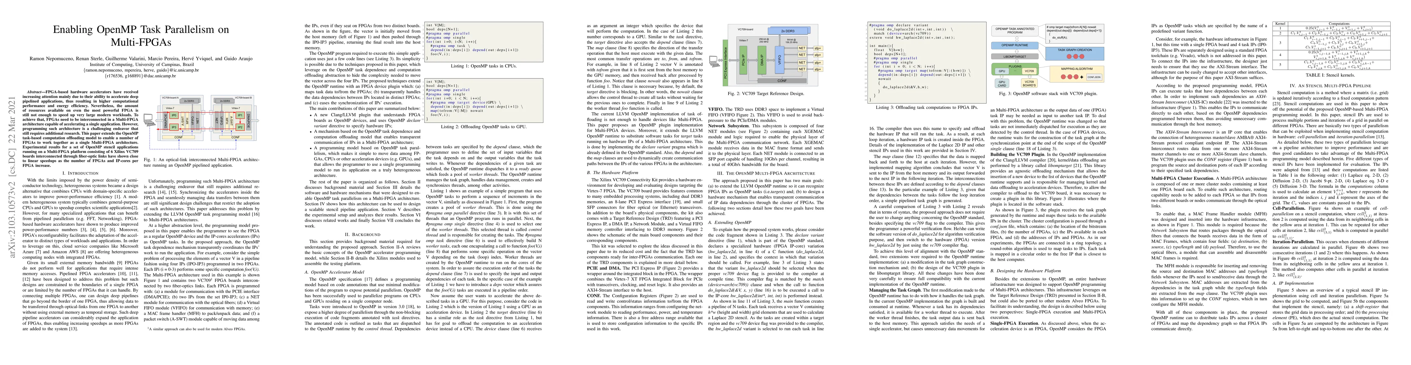 This paper extends OpenMP to enable task parallelism across multiple FPGAs in a Multi-FPGA architecture, demonstrating near-linear speedups in performance for OpenMP stencil applications as more FPGAs are utilized. Experimental results on a platform of 6 Xilinx VC709 boards show promising scalability and efficiency.
