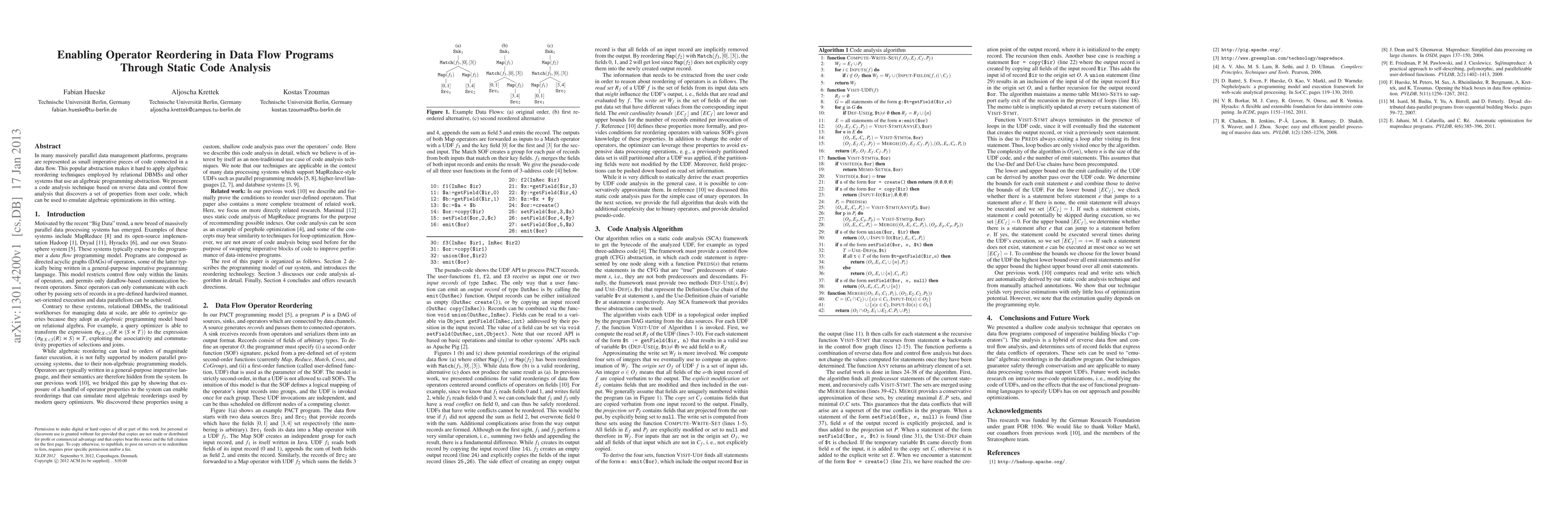 This paper proposes a static code analysis technique to enable operator reordering in data flow programs, using reverse data and control flow analysis to identify properties that allow for algebraic optimizations in parallel data management platforms. The method aims to bridge the gap between data flow and algebraic programming abstractions.