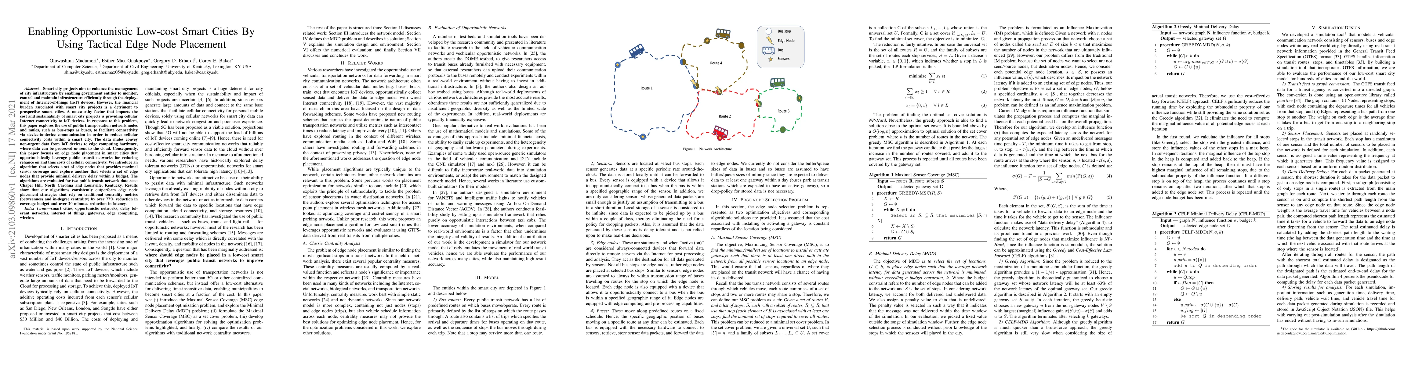 Smart city projects aim to enhance the management of city infrastructure by enabling government entities to monitor, control and maintain infrastructure efficiently through the deployment of Internet-of-things (IoT) devices. However, the financial burden associated with smart city projects is a detriment to prospective smart cities. A noteworthy factor that impacts the cost and sustainability of smart city projects is providing cellular Internet connectivity to IoT devices. In response to this problem, this paper explores the use of public transportation network nodes and mules, such as bus-stops as buses, to facilitate connectivity via device-to-device communication in order to reduce cellular connectivity costs within a smart city. The data mules convey non-urgent data from IoT devices to edge computing hardware, where data can be processed or sent to the cloud. Consequently, this paper focuses on edge node placement in smart cities that opportunistically leverage public transit networks for reducing reliance on and thus costs of cellular connectivity. We introduce an algorithm that selects a set of edge nodes that provides maximal sensor coverage and explore another that selects a set of edge nodes that provide minimal delivery delay within a budget. The algorithms are evaluated for two public transit network data-sets:Chapel Hill, North Carolina and Louisville, Kentucky. Results show that our algorithms consistently outperform edge node placement strategies that rely on traditional centrality metrics(betweenness and in-degree centrality) by over 77% reduction in coverage budget and over 20 minutes reduction in latency.
