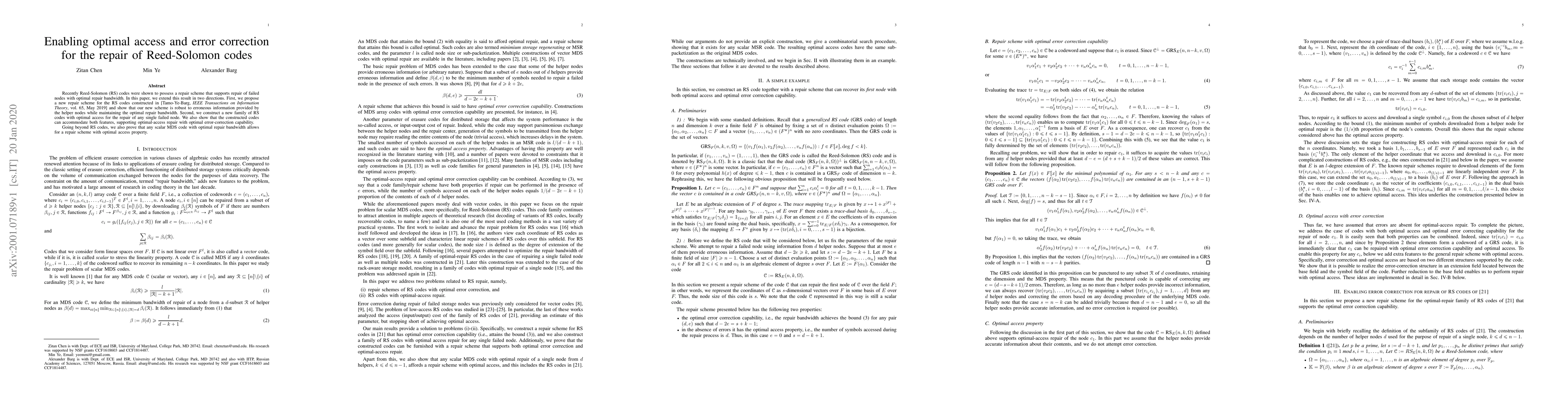 This paper proposes a new repair scheme for Reed-Solomon codes that maintains optimal repair bandwidth while being robust to erroneous information from helper nodes. It also constructs a new family of RS codes that support both optimal access for repair and optimal error-correction capability.
