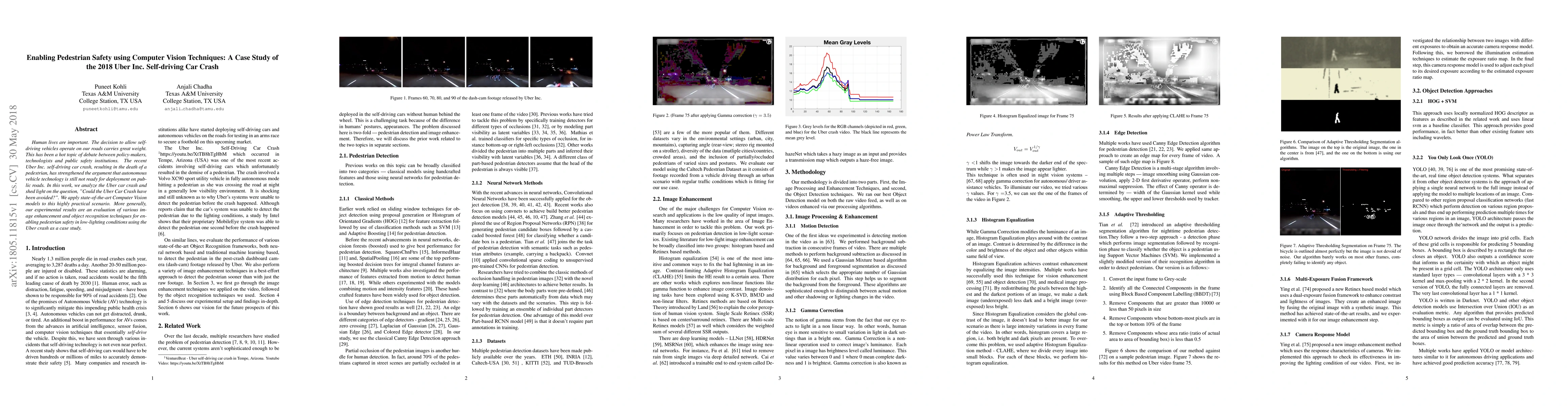 Human lives are important. The decision to allow self-driving vehicles operate on our roads carries great weight. This has been a hot topic of debate between policy-makers, technologists and public safety institutions. The recent Uber Inc. self-driving car crash, resulting in the death of a pedestrian, has strengthened the argument that autonomous vehicle technology is still not ready for deployment on public roads. In this work, we analyze the Uber car crash and shed light on the question, "Could the Uber Car Crash have been avoided?". We apply state-of-the-art Computer Vision models to this highly practical scenario. More generally, our experimental results are an evaluation of various image enhancement and object recognition techniques for enabling pedestrian safety in low-lighting conditions using the Uber crash as a case study.