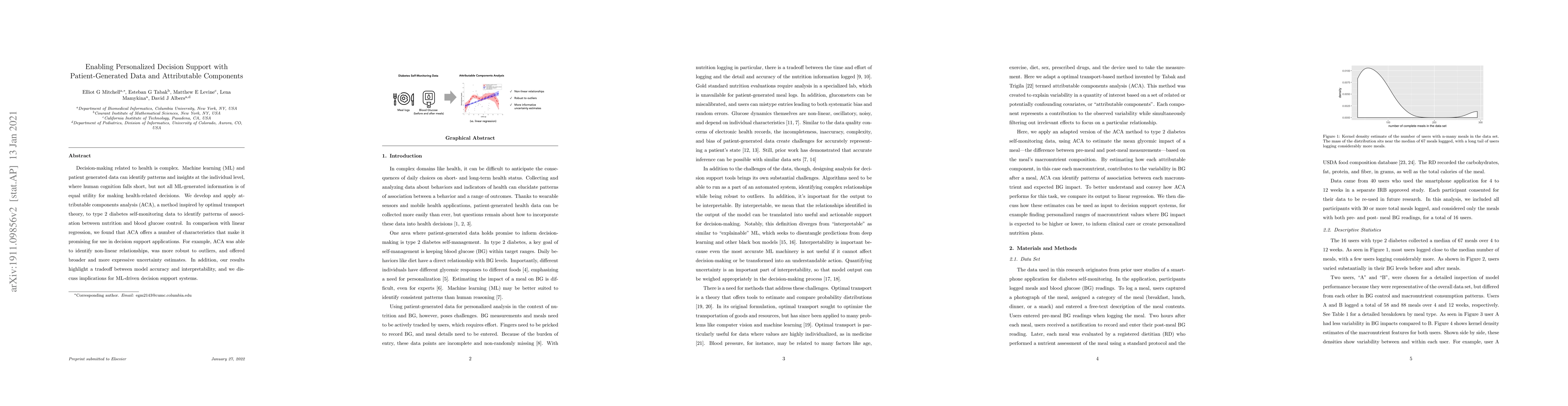 Decision-making related to health is complex. Machine learning (ML) and patient generated data can identify patterns and insights at the individual level, where human cognition falls short, but not all ML-generated information is of equal utility for making health-related decisions. We develop and apply attributable components analysis (ACA), a method inspired by optimal transport theory, to type 2 diabetes self-monitoring data to identify patterns of association between nutrition and blood glucose control. In comparison with linear regression, we found that ACA offers a number of characteristics that make it promising for use in decision support applications. For example, ACA was able to identify non-linear relationships, was more robust to outliers, and offered broader and more expressive uncertainty estimates. In addition, our results highlight a tradeoff between model accuracy and interpretability, and we discuss implications for ML-driven decision support systems.