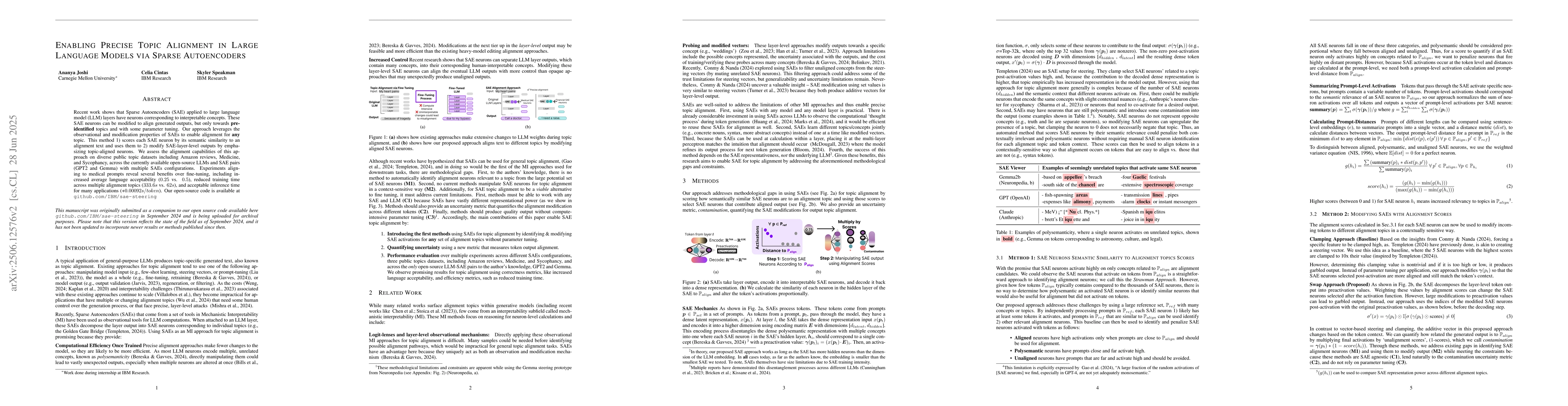 Recent work shows that Sparse Autoencoders (SAE) applied to large language model (LLM) layers have neurons corresponding to interpretable concepts. These SAE neurons can be modified to align generated outputs, but only towards pre-identified topics and with some parameter tuning. Our approach leverages the observational and modification properties of SAEs to enable alignment for any topic. This method 1) scores each SAE neuron by its semantic similarity to an alignment text and uses them to 2) modify SAE-layer-level outputs by emphasizing topic-aligned neurons. We assess the alignment capabilities of this approach on diverse public topic datasets including Amazon reviews, Medicine, and Sycophancy, across the currently available open-source LLMs and SAE pairs (GPT2 and Gemma) with multiple SAEs configurations. Experiments aligning to medical prompts reveal several benefits over fine-tuning, including increased average language acceptability (0.25 vs. 0.5), reduced training time across multiple alignment topics (333.6s vs. 62s), and acceptable inference time for many applications (+0.00092s/token). Our open-source code is available at github.com/IBM/sae-steering.