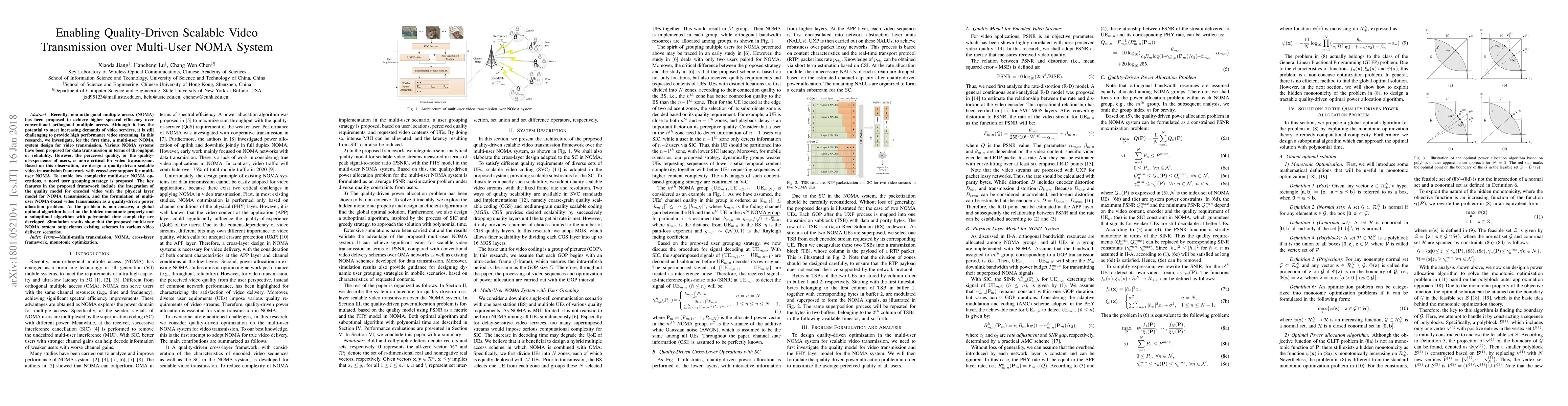 This research proposes a novel quality-driven scalable video transmission framework for multi-user NOMA systems, integrating a quality model with NOMA's physical layer. The study introduces a user grouping strategy and develops algorithms for optimal and suboptimal power allocation, demonstrating superior performance over existing schemes in video delivery scenarios.