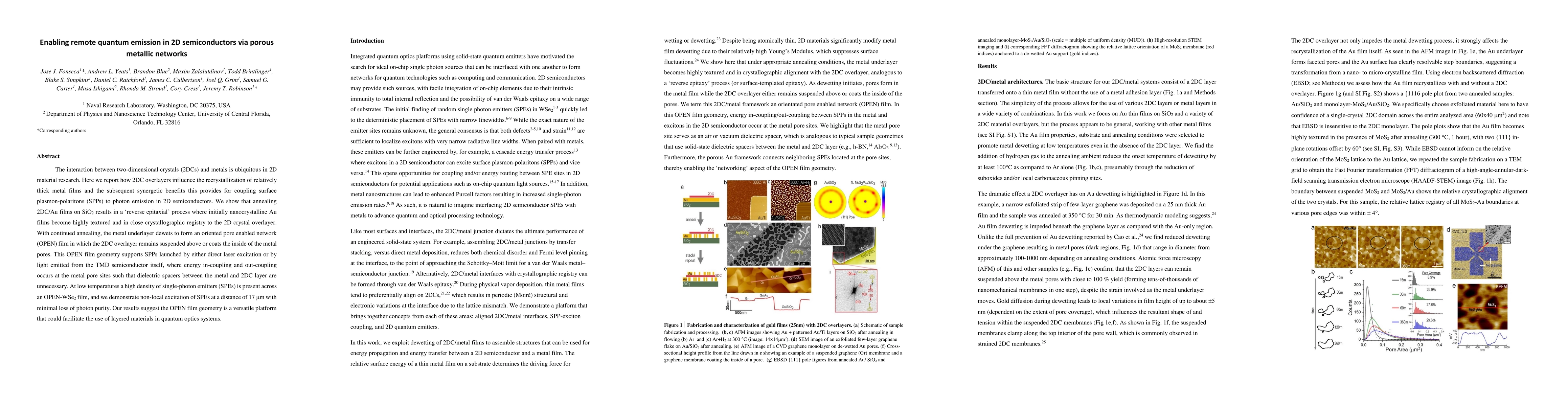 The interaction between two-dimensional crystals (2DCs) and metals is ubiquitous in 2D material research. Here we report how 2DC overlayers influence the recrystallization of relatively thick metal films and the subsequent synergetic benefits this provides for coupling surface plasmon-polaritons (SPPs) to photon emission in 2D semiconductors. We show that annealing 2DC/Au films on SiO2 results in a 'reverse epitaxial' process where initially nanocrystalline Au films become highly textured and in close crystallographic registry to the 2D crystal overlayer. With continued annealing, the metal underlayer dewets to form an oriented pore enabled network (OPEN) film in which the 2DC overlayer remains suspended above or coats the inside of the metal pores. This OPEN film geometry supports SPPs launched by either direct laser excitation or by light emitted from the TMD semiconductor itself, where energy in-coupling and out-coupling occurs at the metal pore sites such that dielectric spacers between the metal and 2DC layer are unnecessary. At low temperatures a high density of single-photon emitters (SPEs) is present across an OPEN-WSe2 film, and we demonstrate non-local excitation of SPEs at a distance of 17 {\mu}m with minimal loss of photon purity. Our results suggest the OPEN film geometry is a versatile platform that could facilitate the use of layered materials in quantum optics systems.