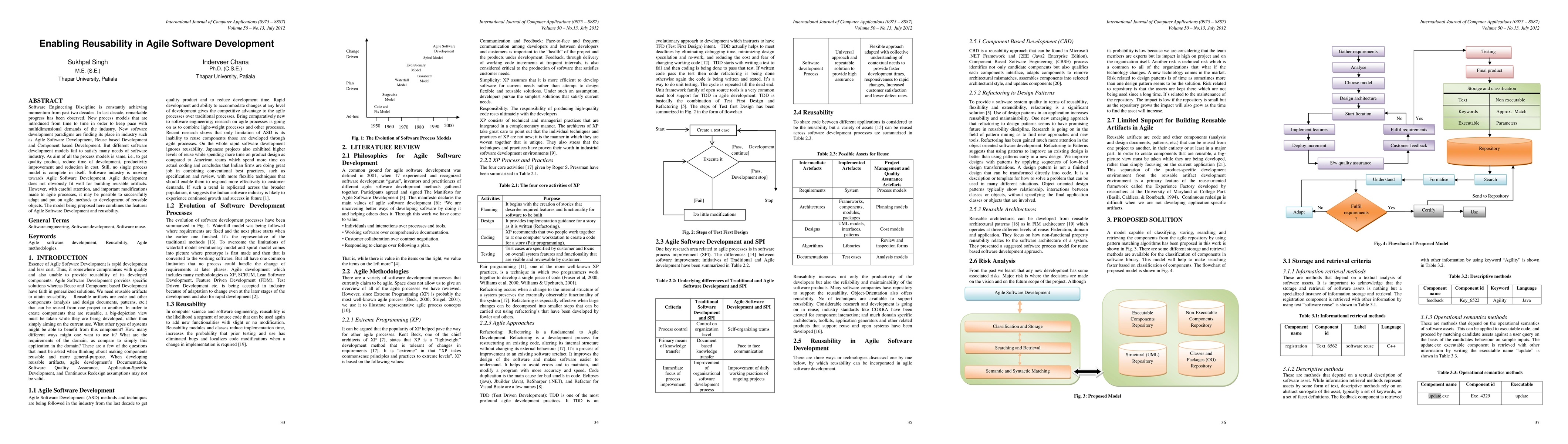 Software Engineering Discipline is constantly achieving momentum from past two decades. In last decade, remarkable progress has been observed. New process models that are introduced from time to time in order to keep pace with multidimensional demands of the industry. New software development paradigms are finding its place in industry such as Agile Software Development, Reuse based Development and Component based Development. But different software development models fail to satisfy many needs of software industry. As aim of all the process models is same, i.e., to get quality product, reduce time of development, productivity improvement and reduction in cost. Still, no single process model is complete in itself. Software industry is moving towards Agile Software Development. Agile development does not obviously fit well for building reusable artifacts. However, with careful attention, and important modifications made to agile processes, it may be possible to successfully adapt and put on agile methods to development of reusable objects. The model being proposed here combines the features of Agile Software Development and reusability.