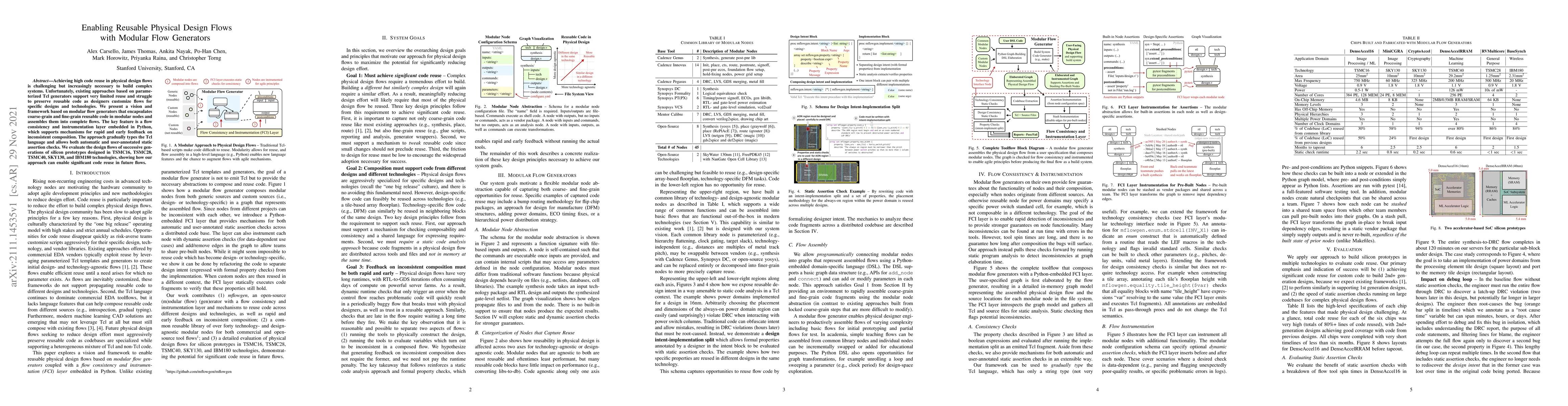 This paper introduces modular flow generators to enhance code reuse in physical design flows, addressing limitations of existing parameterized Tcl generators. The proposed framework uses a Python-based consistency and instrumentation layer to support rapid feedback and static checks, enabling significant code reuse across different technologies.
