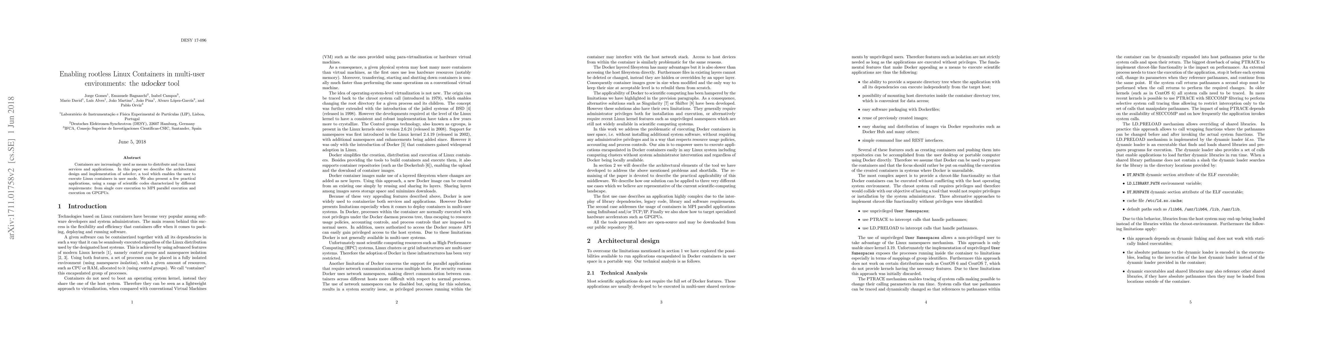 Summary: udocker is a tool designed to enable rootless Linux containers for user-mode execution, facilitating multi-user environments. It supports diverse applications, from single-core to parallel and GPGPU-based scientific computations.
